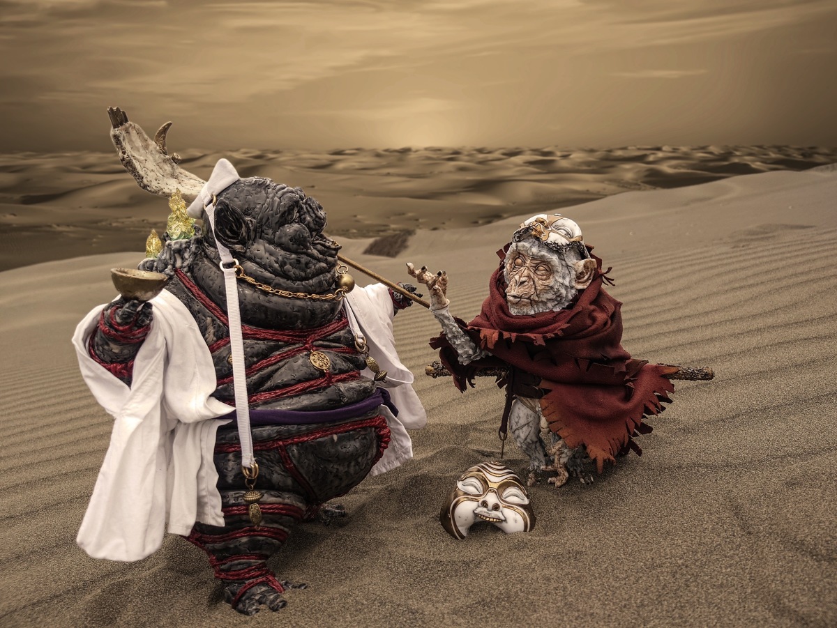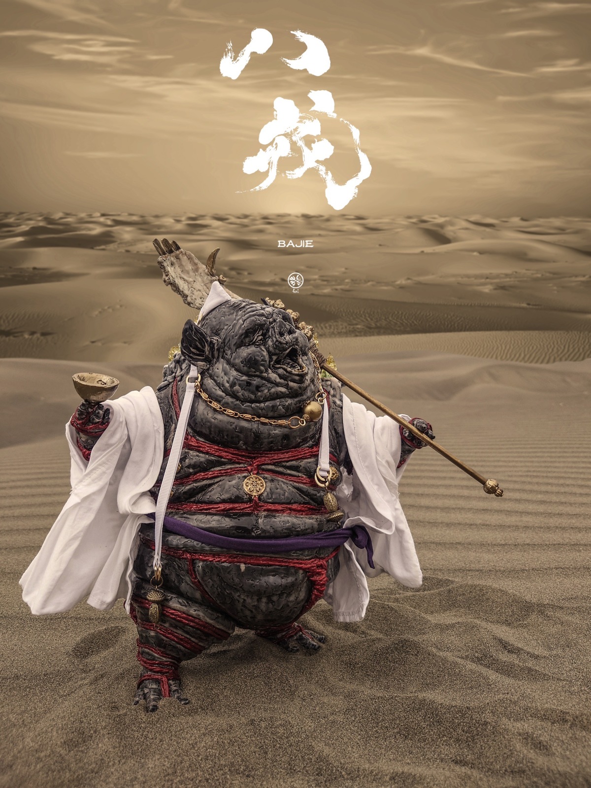 中國古代神話傳說的經典角色「八戒」,經由原型師 許山姆以自身獨樹一幟的妖異風格重新詮釋,打造尺寸高 29 公分的超魄力軟膠,營造出糾糾威風欺太歲,昂昂志氣壓天神的氣勢!配件部分則採用黃銅、樹酯、麻胚布等複合式材料製作。以海量的雕刻細節呈現二師兄的豬臉人身,手執釘鈀龍探爪的特徵造型。粗糙的皮膚與渾身贅肉擠壓出複雜的皺褶,並被紅繩五花大綁,展現獵奇又令人著迷的造型風格!
