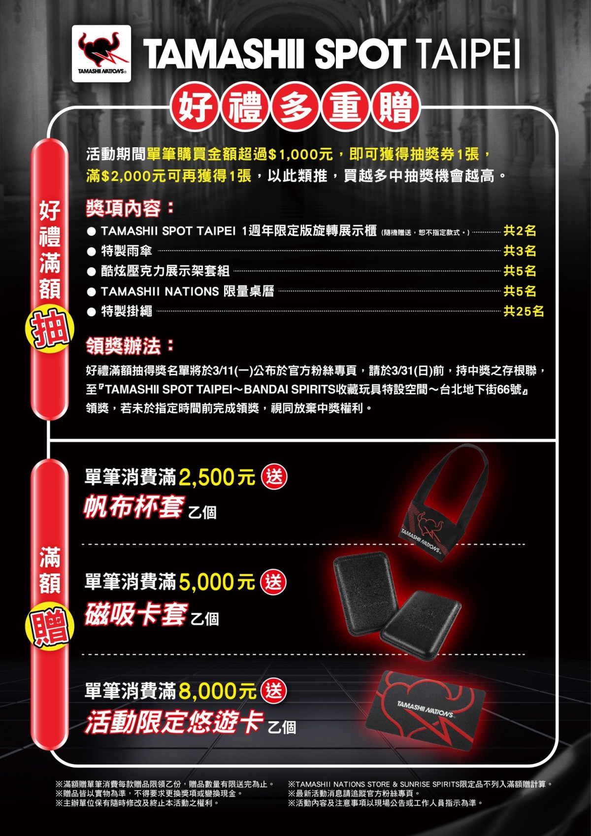 除了拍照集點送,這次 TAMASHII SPOT TAIPEI Gallery Showcase 現場也有豐富的贈獎活動,除了直接的杯套、磁吸卡套、悠遊卡滿額贈禮之外,還有消費越多機會越大的好禮滿額抽,消費滿 1,000 元即可獲得一張抽獎券(依此類推),有機會把旋轉展示櫃、壓克力展示架、雨傘、桌曆、掛繩帶回家!