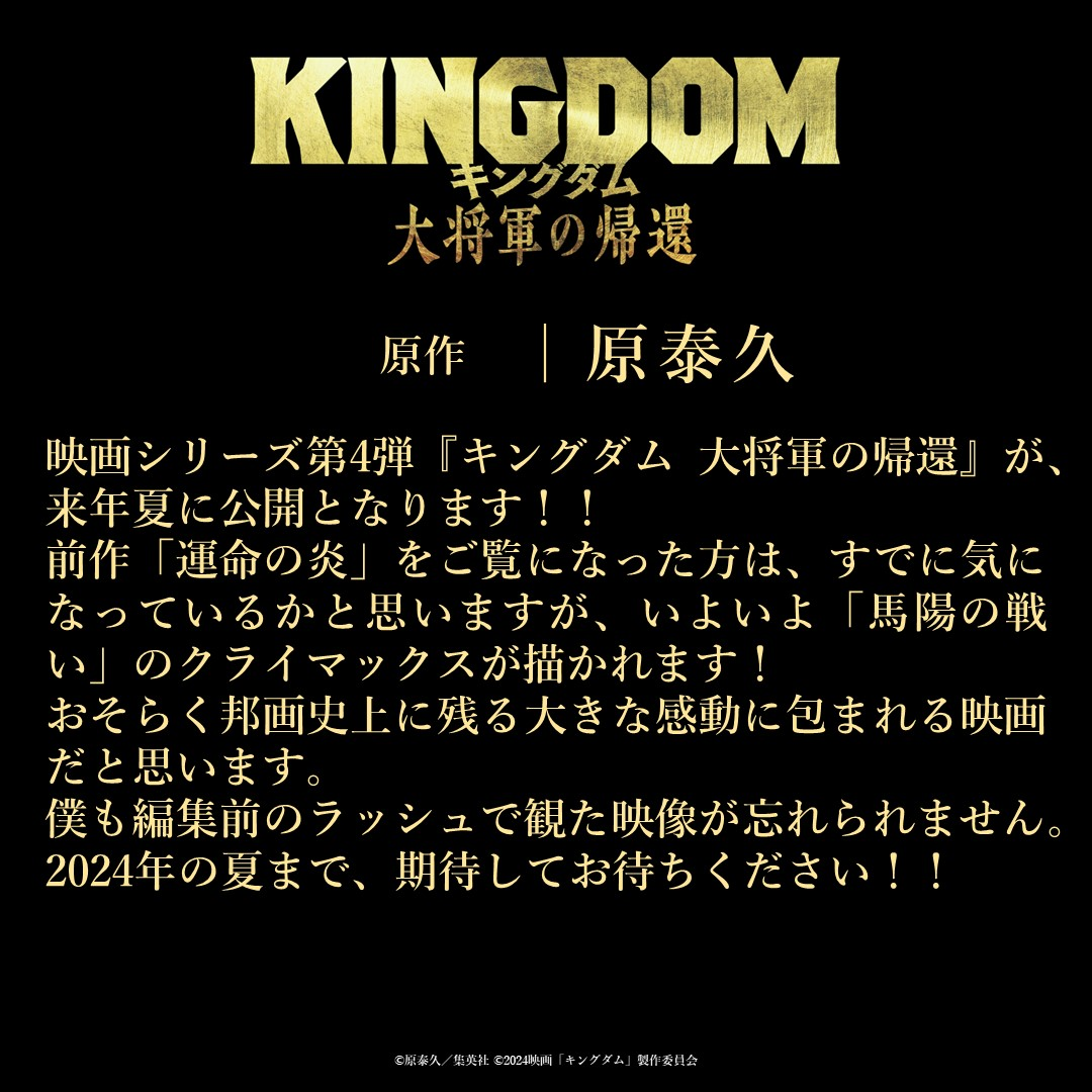 也在去年 12 月官方釋出第四部《王者天下4 大將軍的歸來》( 暫譯,キングダム 大将軍の帰還 ),今日 ( 2/23 ) 官方也正式公開了海報視覺圖以及特報影片,將於 2024 年 7 月 12 日上映,連續三年都在夏天上檔。
