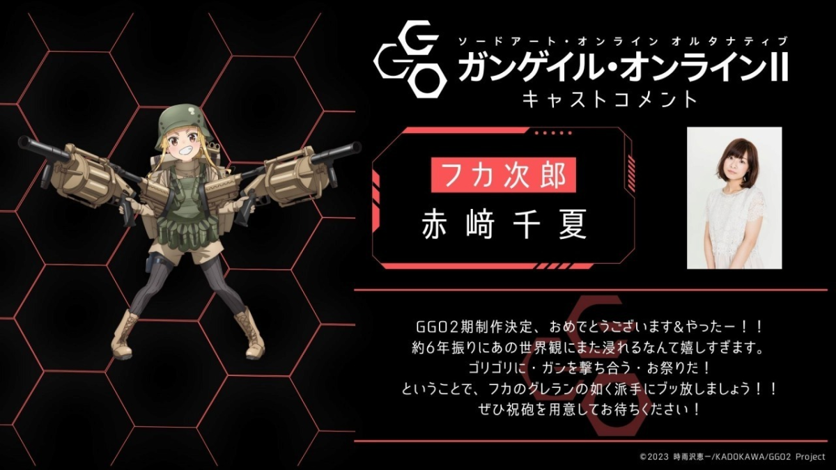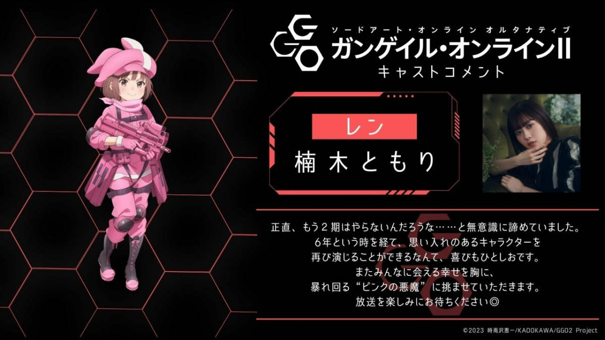 相隔六年的第二季,除了配音蓮的聲優楠木燈勢必登場外,不可次郎/篠原美優 ( CV : 赤崎千夏 )、Pitohui/神崎艾莎 ( CV : 日笠陽子 ) 與 M/阿僧祇豪志 ( CV : 興津和幸 ) 都一併回歸,雖說大家好像都原本以為第二季動畫有點無望了,沒想到還是可以配音第二季演出,還是恭喜並期待播出的到來。