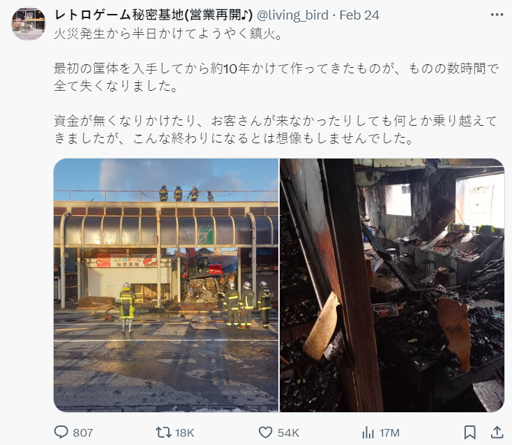不過近日在日本 X 傳來一個悲劇,這間開設在青森縣十和田市的「復古風遊戲秘密基地」 ( レトロゲーム秘密基地 ),收藏了店主十多年來苦心收集的許多大型遊戲機台,這些想必是不少六七年級生的回憶,卻因隔壁商店失火延燒,讓這些收藏與原本提供人遊玩的回憶,一夜之間付之一炬,讓不少網友感到失落,簡直是老電玩博物館等級的店家就這樣沒了。