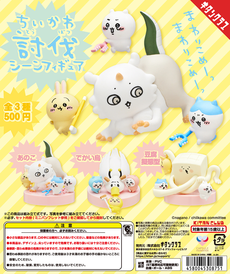 Kitan Club「吉伊卡哇討伐場景」轉蛋,首次將令人印象深刻的討伐場景立體化!以約高 6 公分的尺寸,細膩地還原在大型討伐篇中,小可愛、小八貓和小兔兔組隊執行討伐任務的生動造型,收錄有:「那孩子」、「大鳥」、「豆腐擬態型」三種款式,角色們的表情和肢體動作都忠於原作,勇敢對抗奇美拉的模樣實在令人感到振奮!由於可組裝,因此具有扭蛋玩具所沒有的份量感。三款一字排開超級可愛