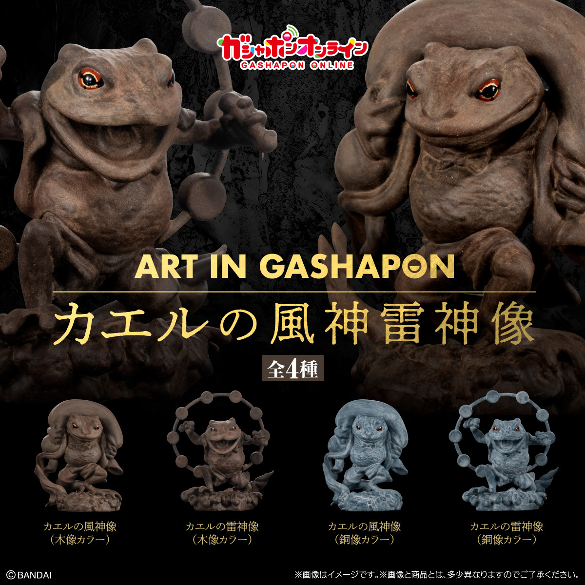 「Art in Gashapon 青蛙的風神雷神像」轉蛋,將爬蟲兩棲類學研究博士 Kazutaso Company 創作的『蛙×佛像(カエル×仏像)』系列作品以 8 公分的轉蛋尺寸立體化!結合日本國寶級畫作「風神雷神圖屏風」,化身為青蛙型態的風雷神,細膩刻劃出青蛙皮膚粗糙的小疙瘩、炯炯有神的大眼等,並有施以不同質感塗裝的木像、銅像兩種配色,營造出不凡的尊貴感和魅力感!