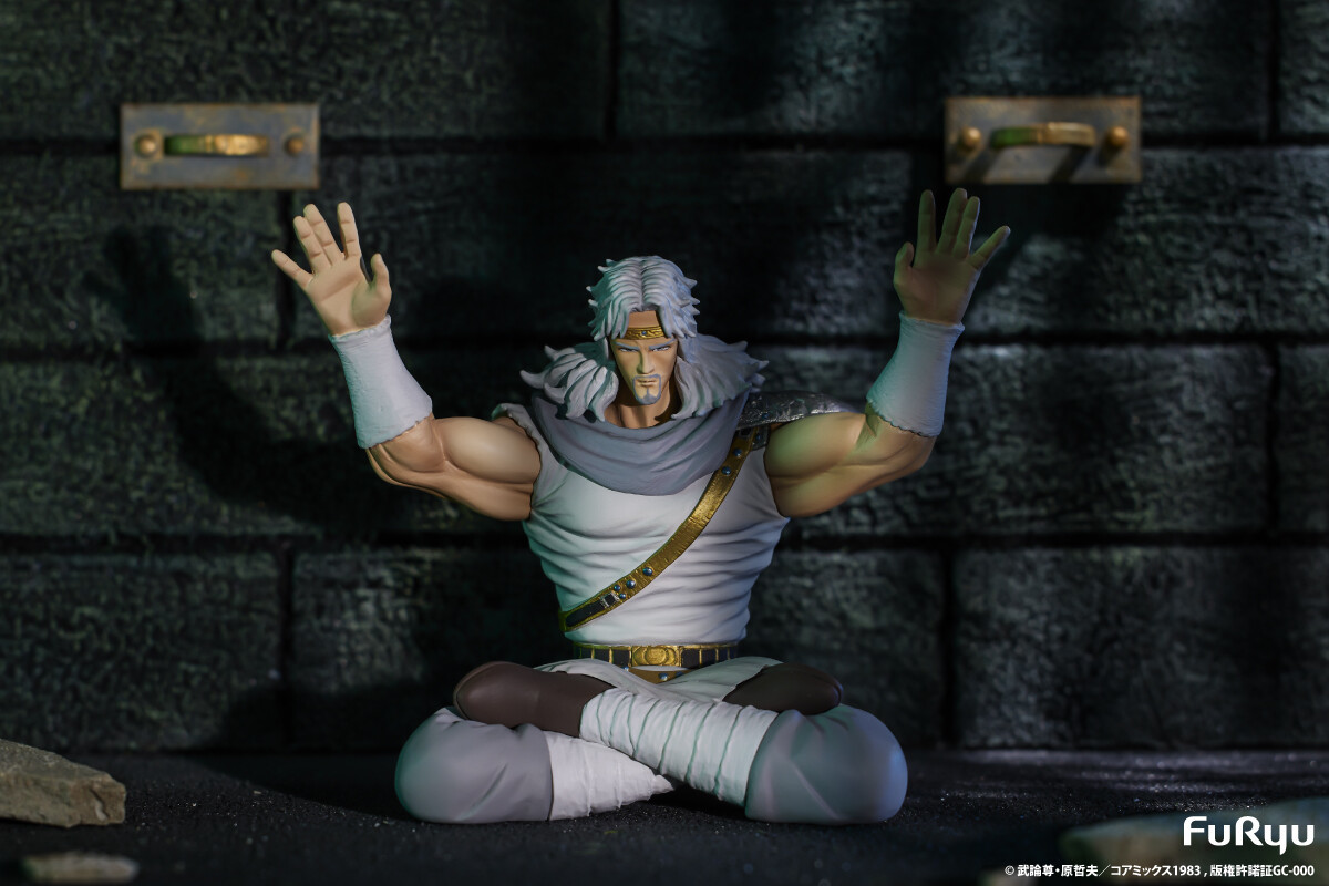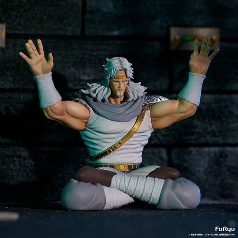 FuRyu「托席泡麵蓋模型」,尺寸全高約 12 公分,將原作中的名場面忠實再現,還原托席盤腿靜坐姿並雙手舉起的「北斗有情破顏拳」施放姿態!你各位還吃啊?就舒舒服服地胖死吧~!托席銳利的目光,強壯的肌肉線條與全身服裝的皺褶、護甲等細節也細膩刻劃,讓你壓泡麵也能充滿威壓感!