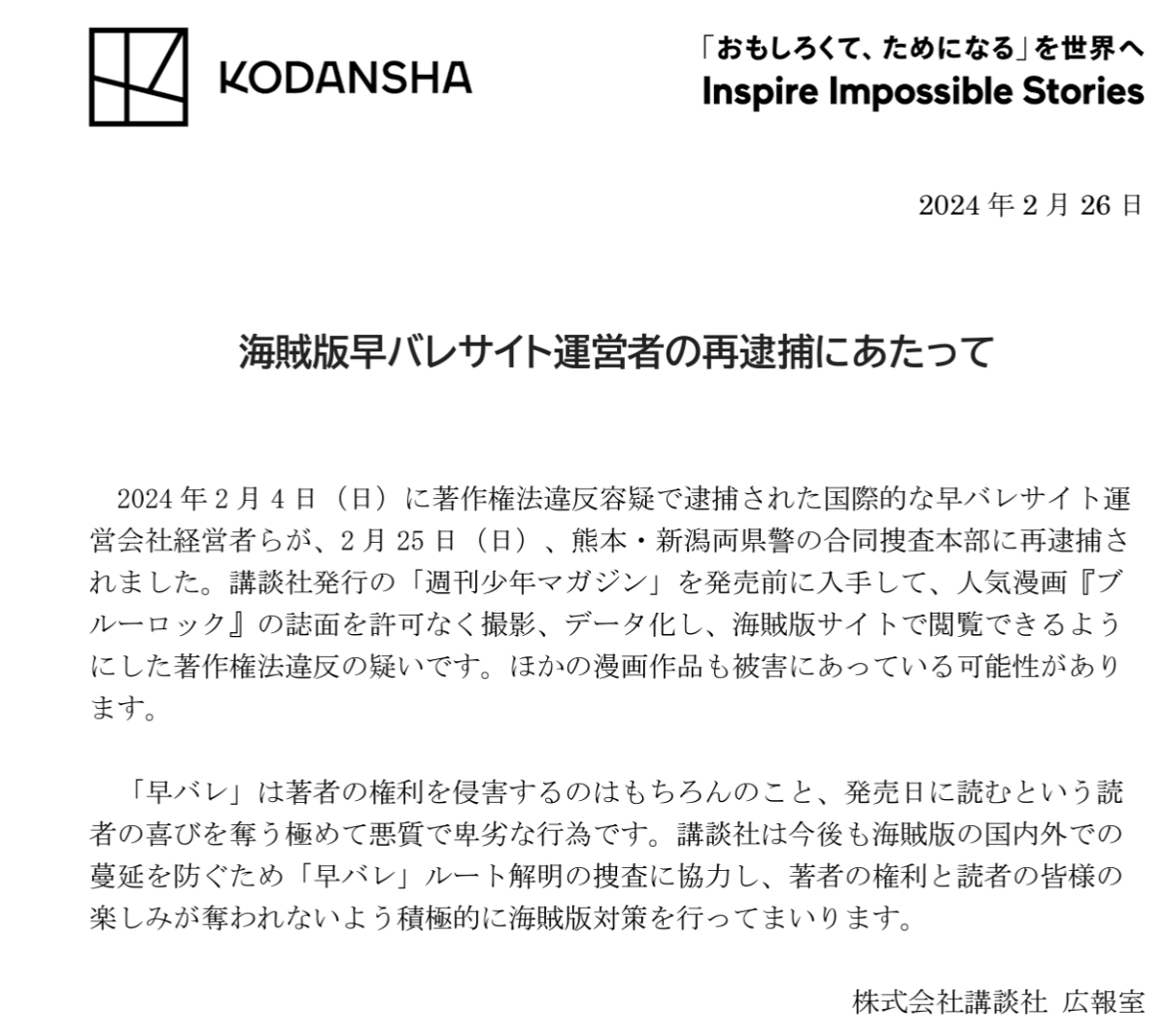 沒想到不到一個月,講談社又公布了所屬同個集團的盜版業者,在熊本與新潟縣的警方協力下破獲翻拍發行前的《週刊少年Magazine》流給海外盜版網站,再次被逮。