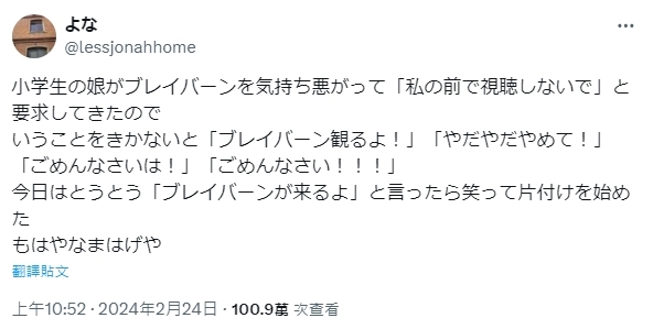這是一件相當令人欣慰的事情,然而沒想到凡事都有反例,近日日本一名熱愛ACG的媽媽,竟然因為「播放《勇氣爆發Bang Bravern》的方式」引起爭議,甚至有人認為這算是一種虐待兒童。