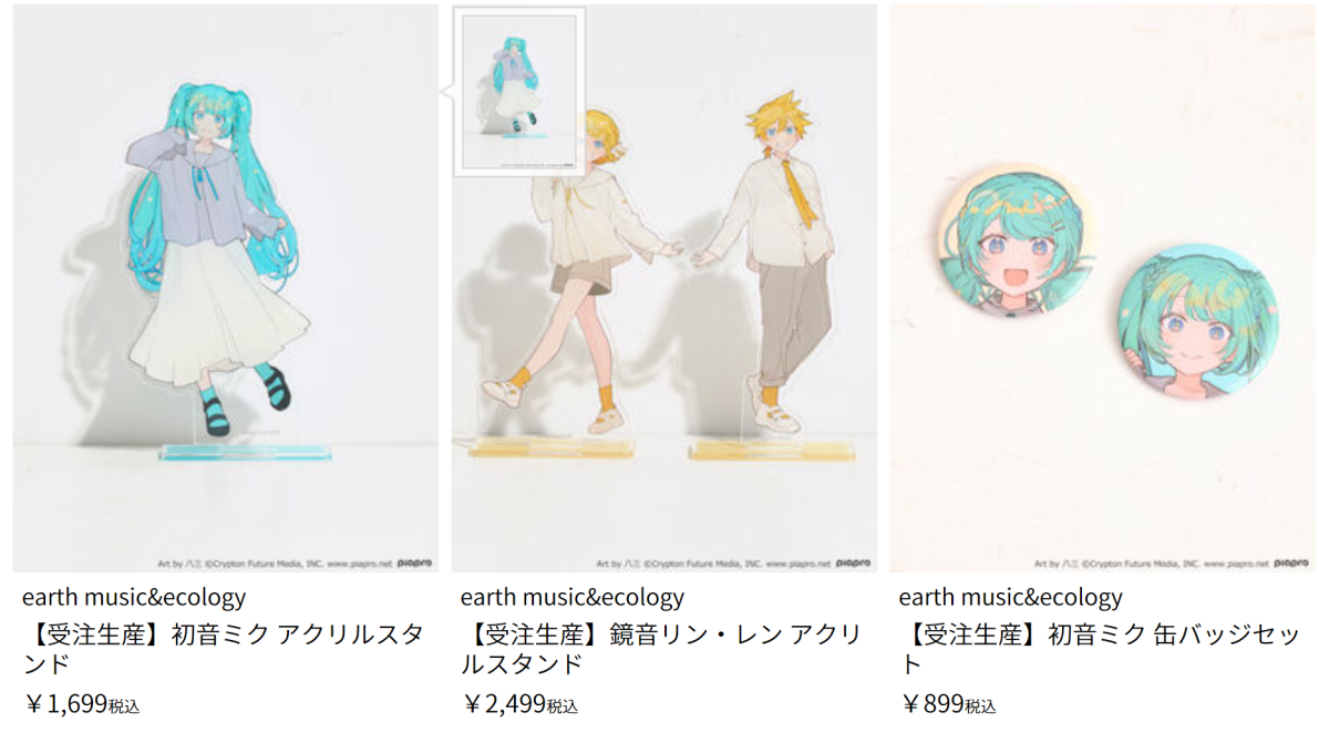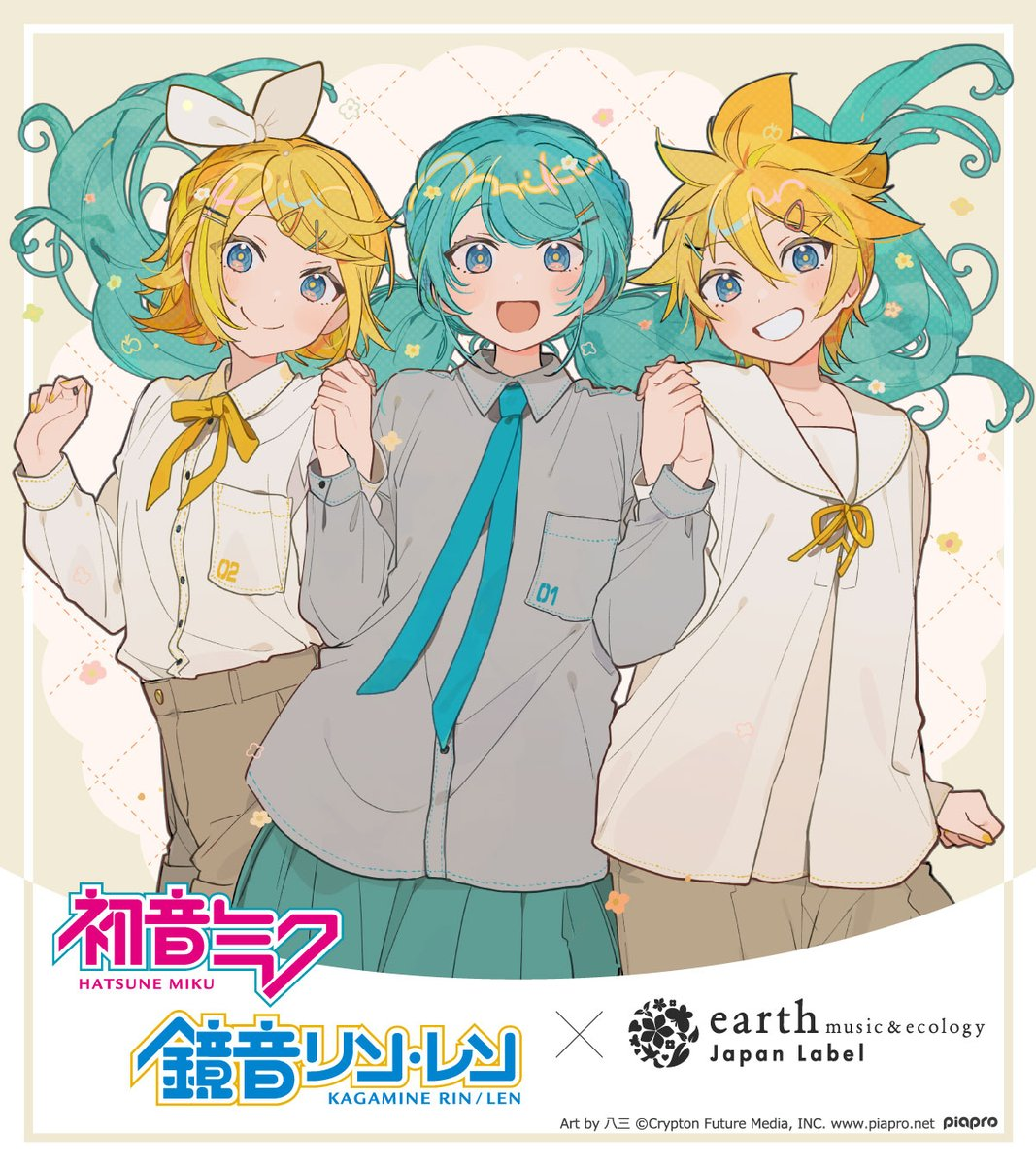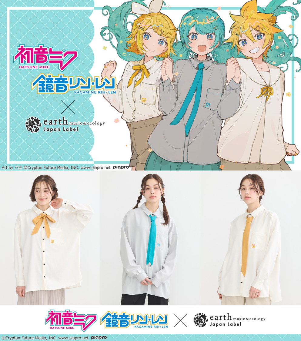 隸屬 STRIPE CLUB 電商旗下的服飾品牌 earth music&ecology,其支線 Japan Label 與先前與動畫的《咒術迴戰》合作推出聯名服飾大受好評。這次改與VOCALOID 的「初音未來」以及「鏡音鈴、連」合作,推出以三位為概念的女裝服飾配件,於 3 月 1 日起於電商平台 STRIPE CLUB 開放預購。
