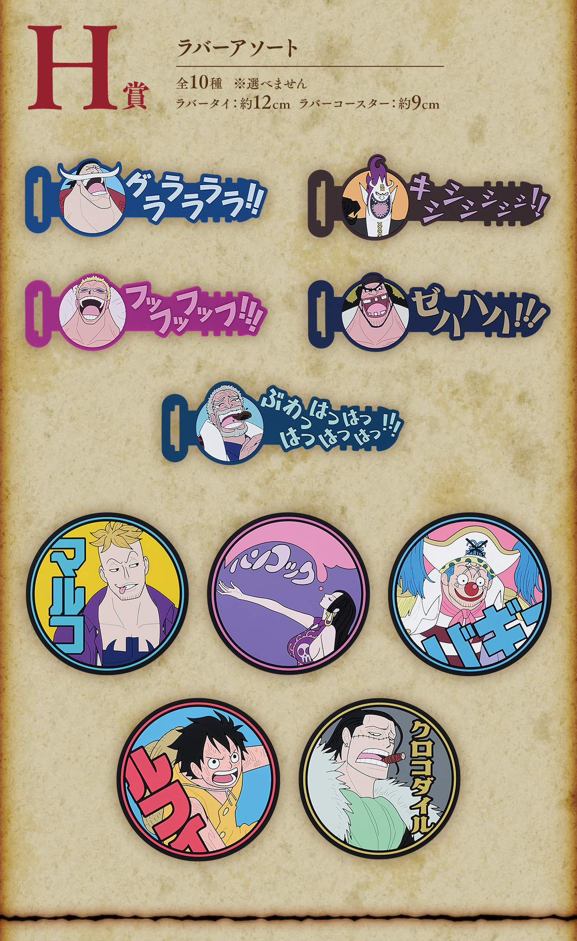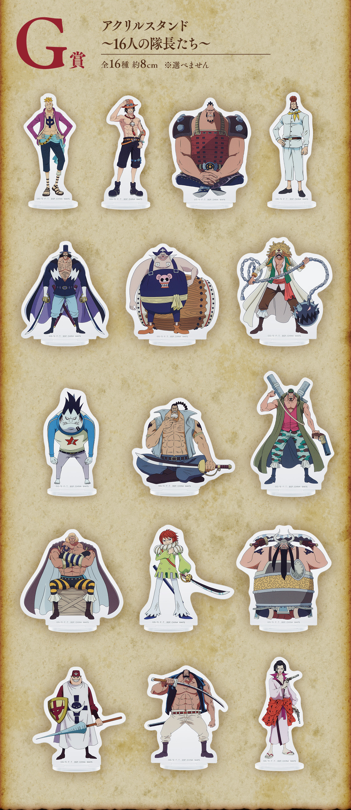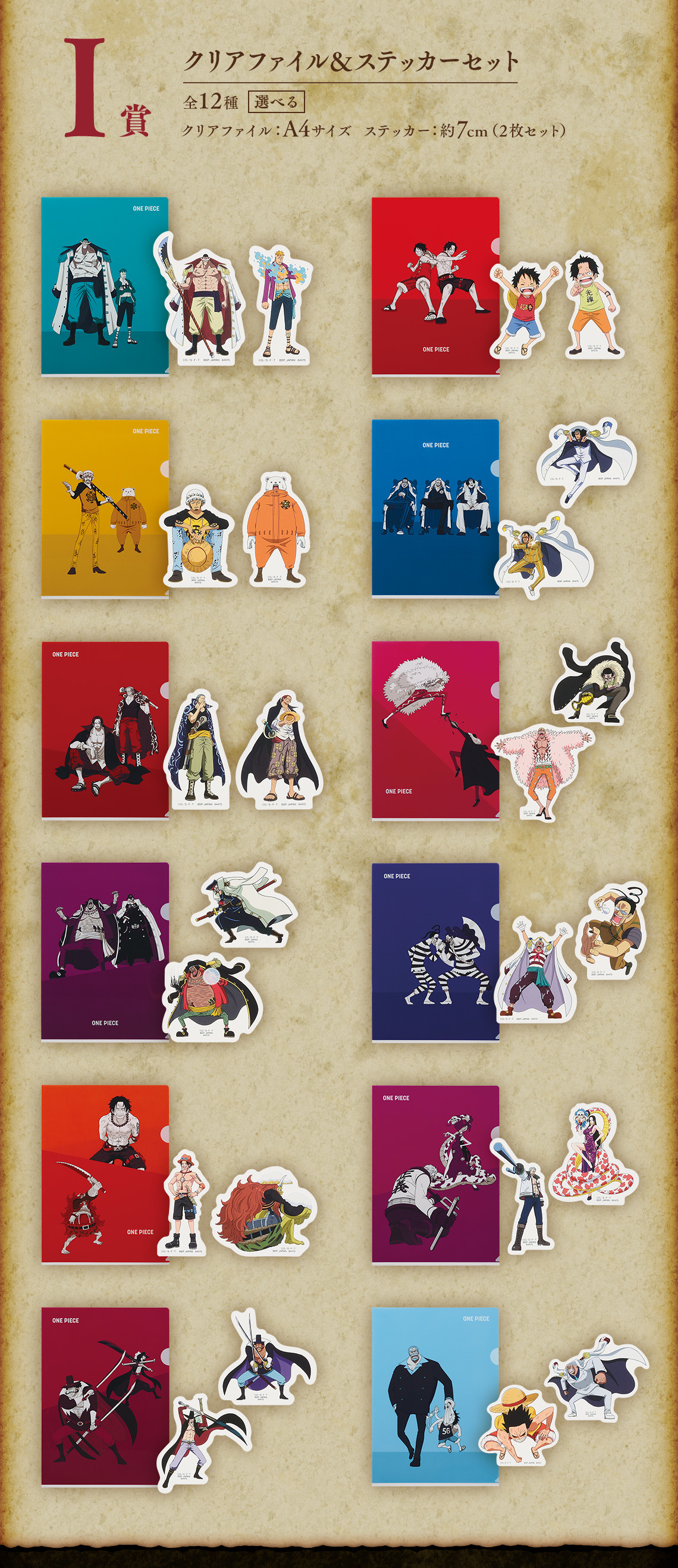 F~I 賞則分別為白鬍子馬克杯、16 位隊長的壓克力立牌、各式橡膠商品組合、文件夾與貼紙套裝,其中文件夾和貼紙組將多位有著有趣或是深厚情誼的角色兩兩一組搭配,像是小歐斯 Jr. 跟艾斯、小丑巴奇和 Mr.3 等等,相當的有巧思!一次推出超多位白鬍子海賊團角色大集合,相信海賊王的粉絲們都已經迫不及待了!