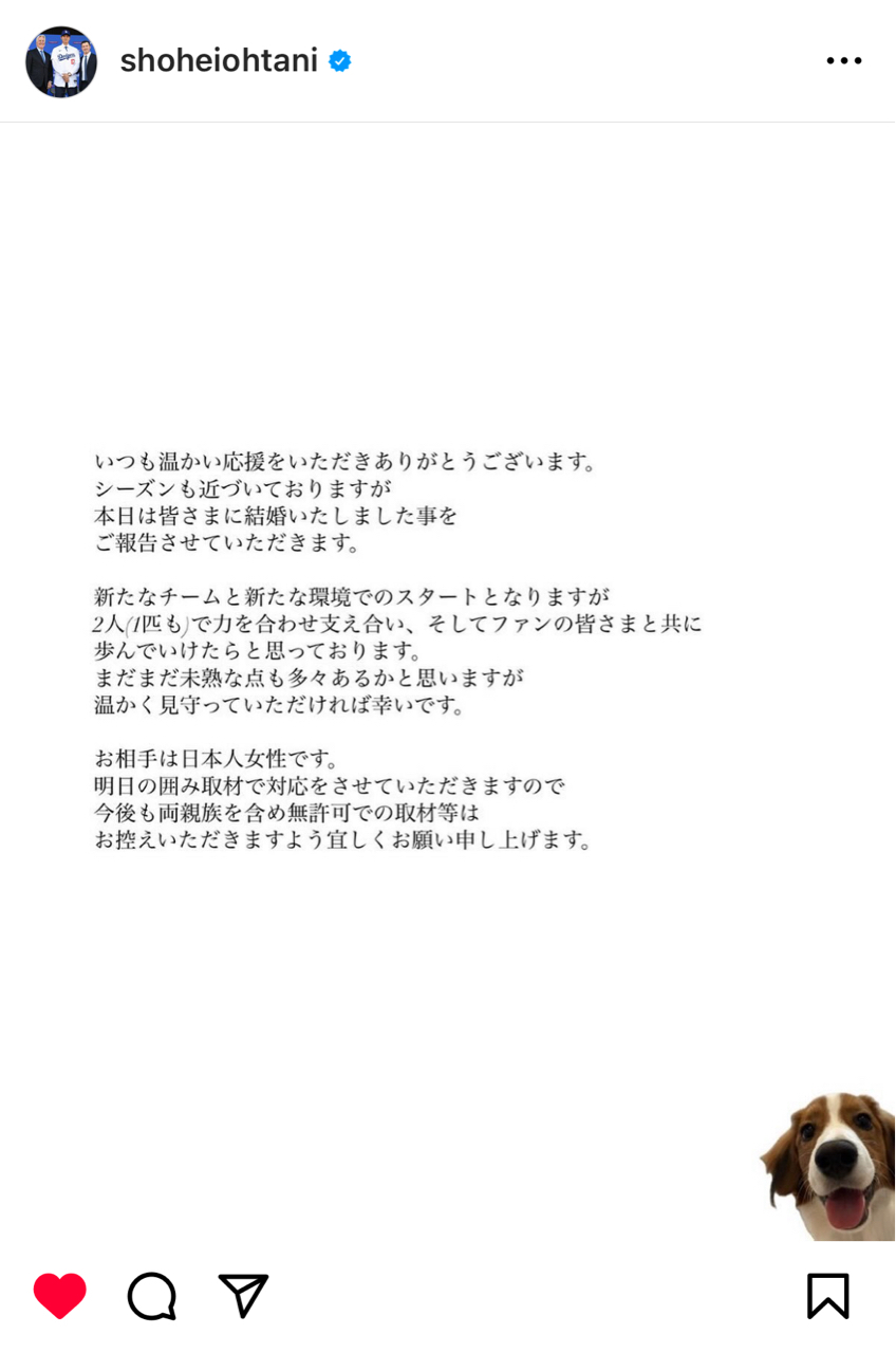 大谷翔平在個人 instagram 上貼文,表示非常感謝一路以來粉絲球迷熱切的關心支持,大聯盟即將開季,在今天也正式踏上結婚的人生里程碑。