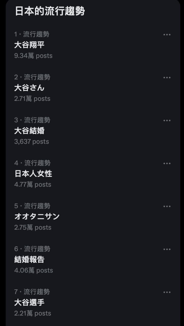 ▼ 大谷結婚立刻成為 X 趨勢頭條。