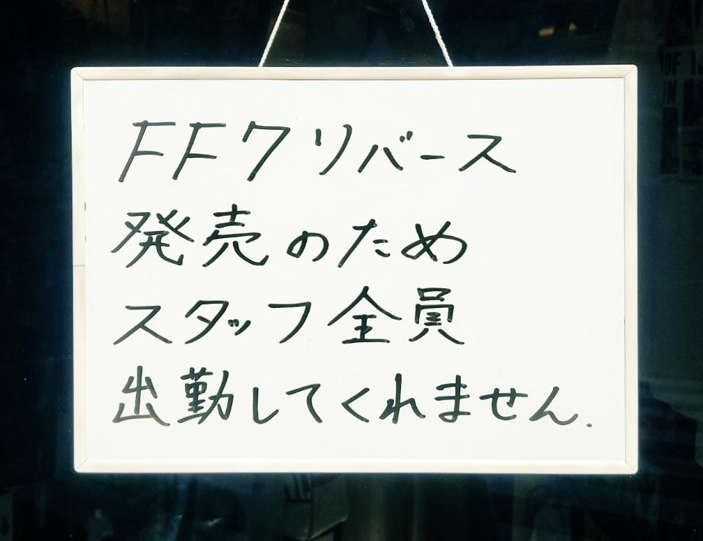 這是由Twitter(現稱X)多名網友所發現,由於《Final Fantasy VII 重生》發售,布只是位於日本新宿的一家整體院沒有半個員工來上班,就連老闆本人似乎也忙著在首發日開玩,以致在門口上不只是掛著本日公休的掛牌,上面更還寫上「因為今天是FF7 重生發售日,所以今天全體員工都不會來上班」,顯然店裡所有人都相當喜歡《Final Fantasy》系列啊XD