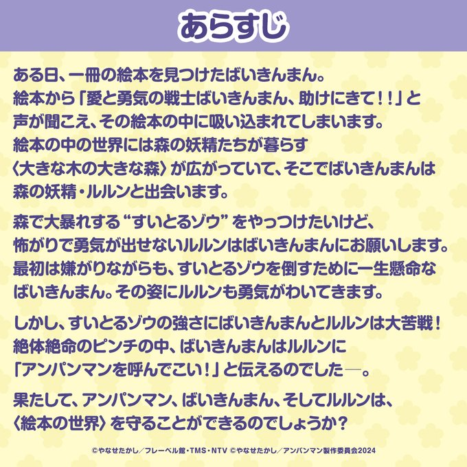 本次劇場版故事大綱如下,有一天,細菌人發現了一本繪本。他聽到繪本裡有個聲音說:「細菌人,愛與勇氣的戰士,來幫助我吧!」然後他就被繪本吸引了。在繪本的世界裡,有一片「巨大樹木的森林」,森林妖精住在那裡,細菌人在那裡遇見了森林妖精ルルン。