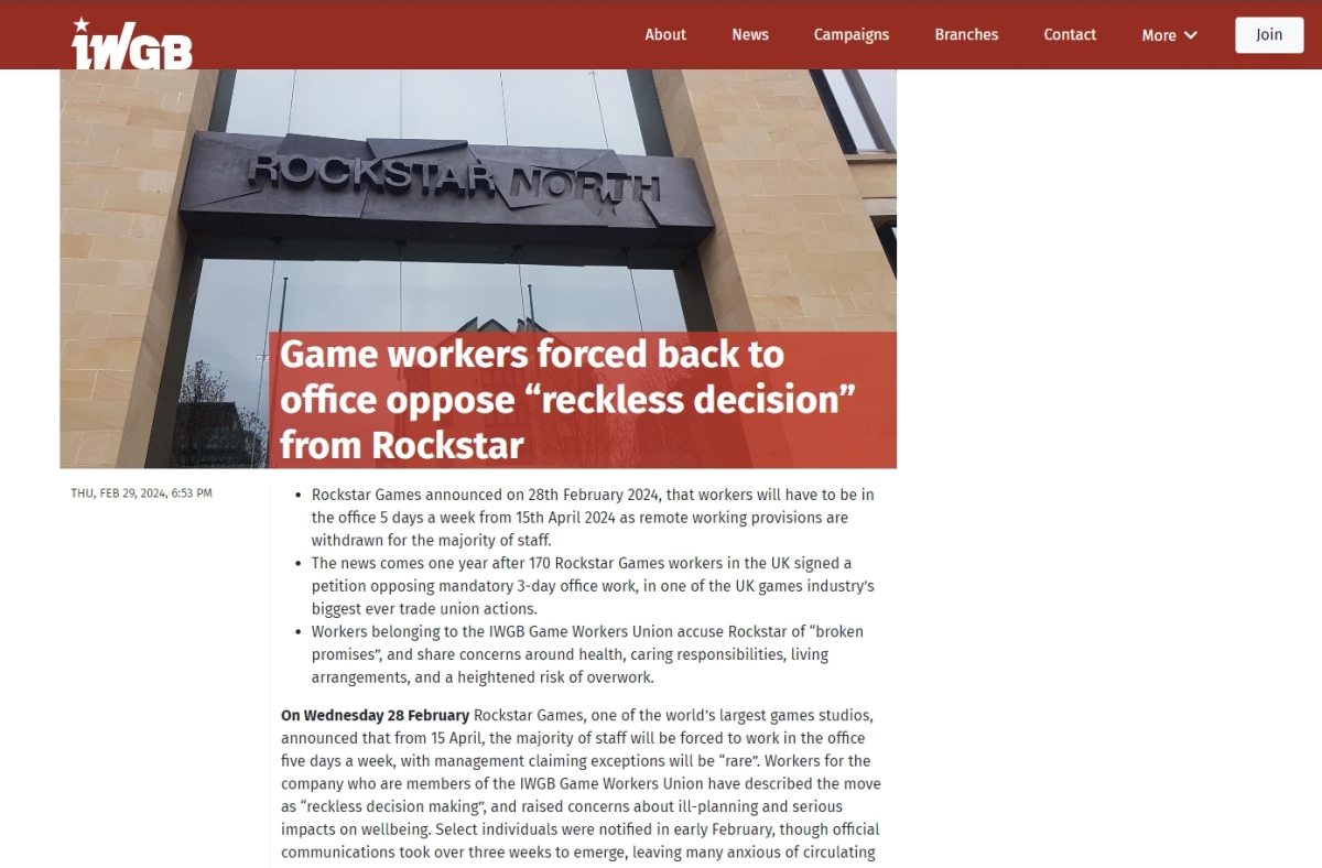 事實上,早在去年IWGB就曾收到來自170名Rockstar Games員工的連署請願書,表示反對公司強制要求員工三天內返回工作崗位。而如今,因為準備《俠盜獵車手VI》最後開發工作,要求團隊成員從2024年4月開始,必須每個禮拜回到公司上班五天,這再次引發了員工的不滿。