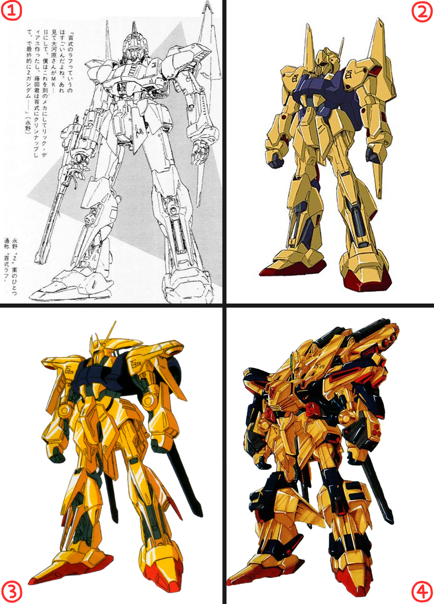 ▼ 1~4 依序為:永野護的 Z 鋼彈草稿、藤田一己重新設計而成的百式、藤田一己基於百式設計的強化機百式改、大河原邦男基於百式改設計的強化機全裝甲百式改。