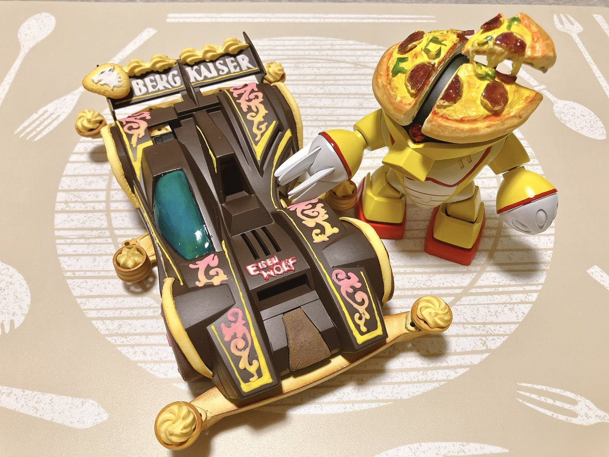 可以看看推主連四驅車都可以跟食物結合在一起,這台《爆走兄弟Let's&Go! ! 》的德國隊鐵狼號搭配了烘焙點心的外觀,配在 Pizza 亞凱邊,更顯趣味。
