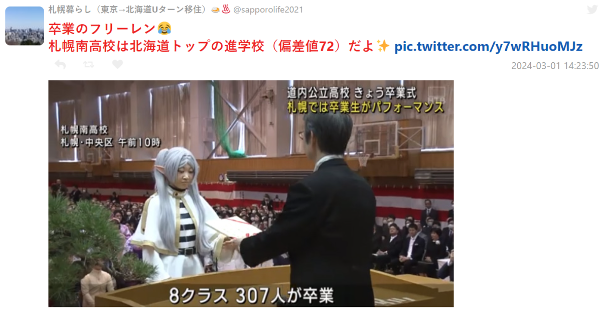 近日各地也開始舉辦畢典來歡送這些學生邁入人生的下一階段,不過有間高中意外引起討論,這間位於北海道的札幌南高中,畢業生幾乎全部都以 Cosplay 的裝扮出席,趣味的場景被媒體報導後讓網友大讚他們的創意。