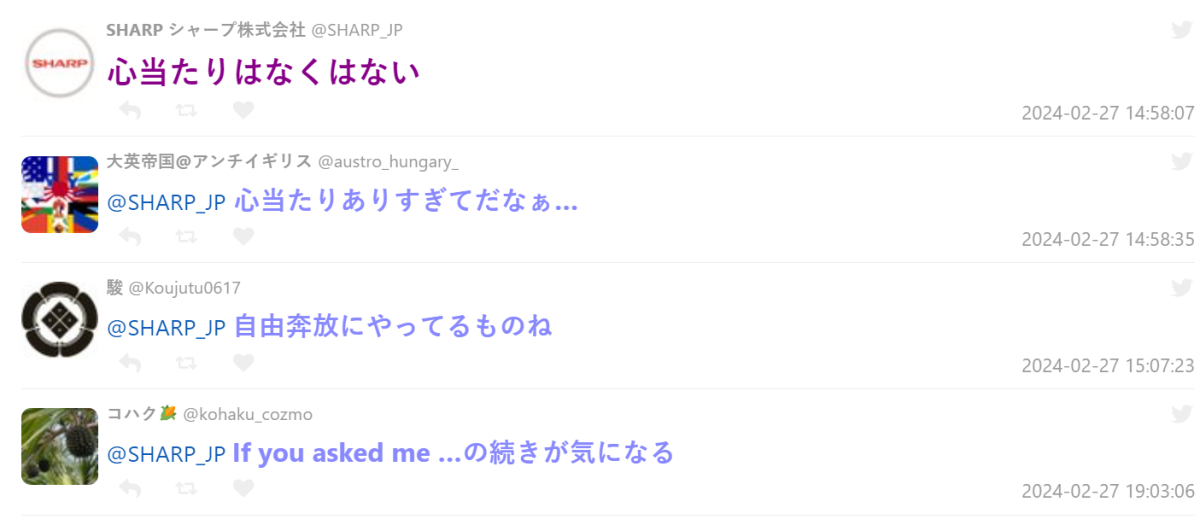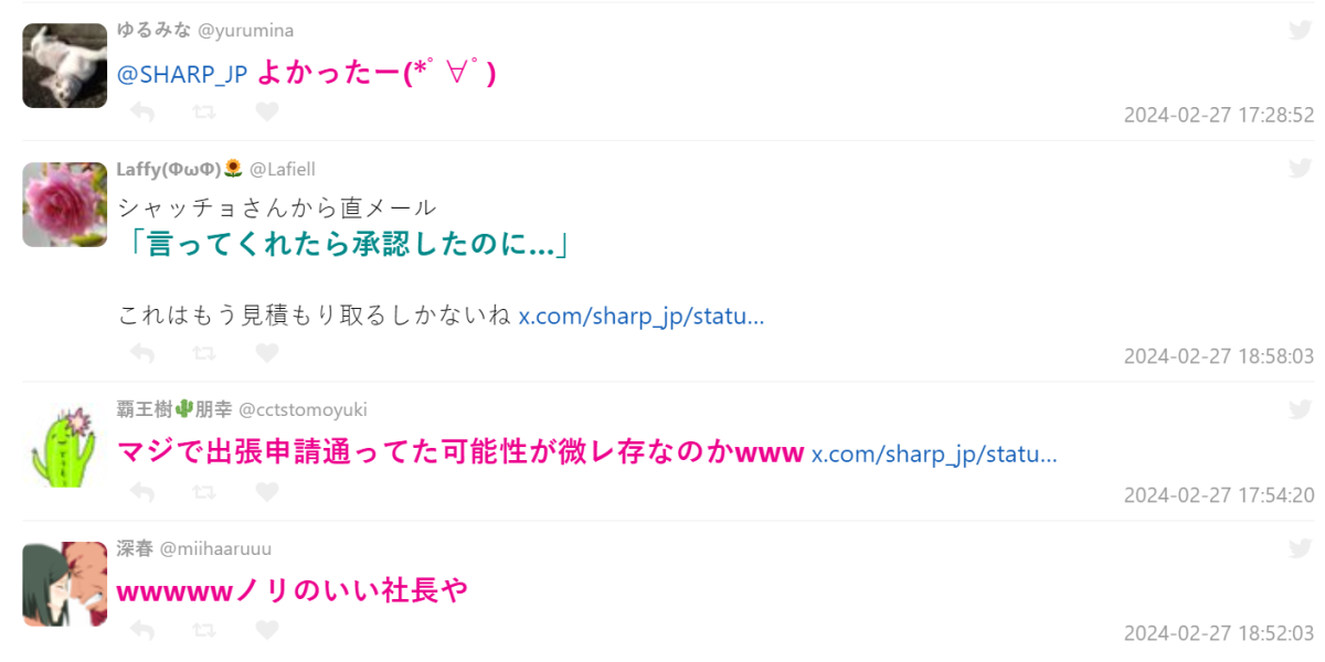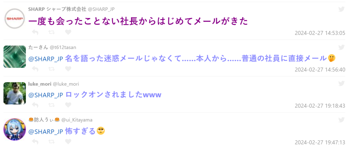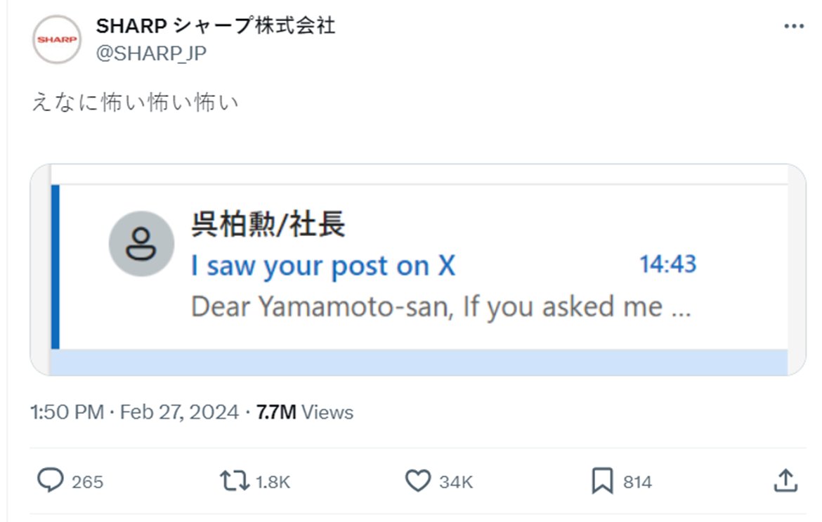 近日日本 X 上,趣味發文跟網友互動備受肯定的電器品牌 SHARP 官方帳號發難,貼出自己突然收到社長的來信,標題直接打上「我看到你在X的po文」,讓他感到驚慌害怕,是否出什麼包,還沒開啟就先貼文,只好來到 X 上討拍 ( ? )。