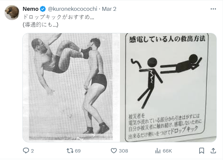 有位身為電工的日本推主在 X 上分享,自己在工作時候會遇到觸電的情況,這時候如果是同事遭受事故該怎麼應對,讓人意外的答案居然是「龍捲旋風腳」,這到底是怎麼回事 ?