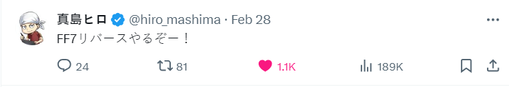 原本在 2 月 28 日的發售前夕,真島浩就已經發文表示,自己要準備開玩《Final Fantasy VII 重生》了,現在還有三部連載作品要趕工的他,應該很忙沒時間把這款需要花時間玩的遊戲好好玩透吧。