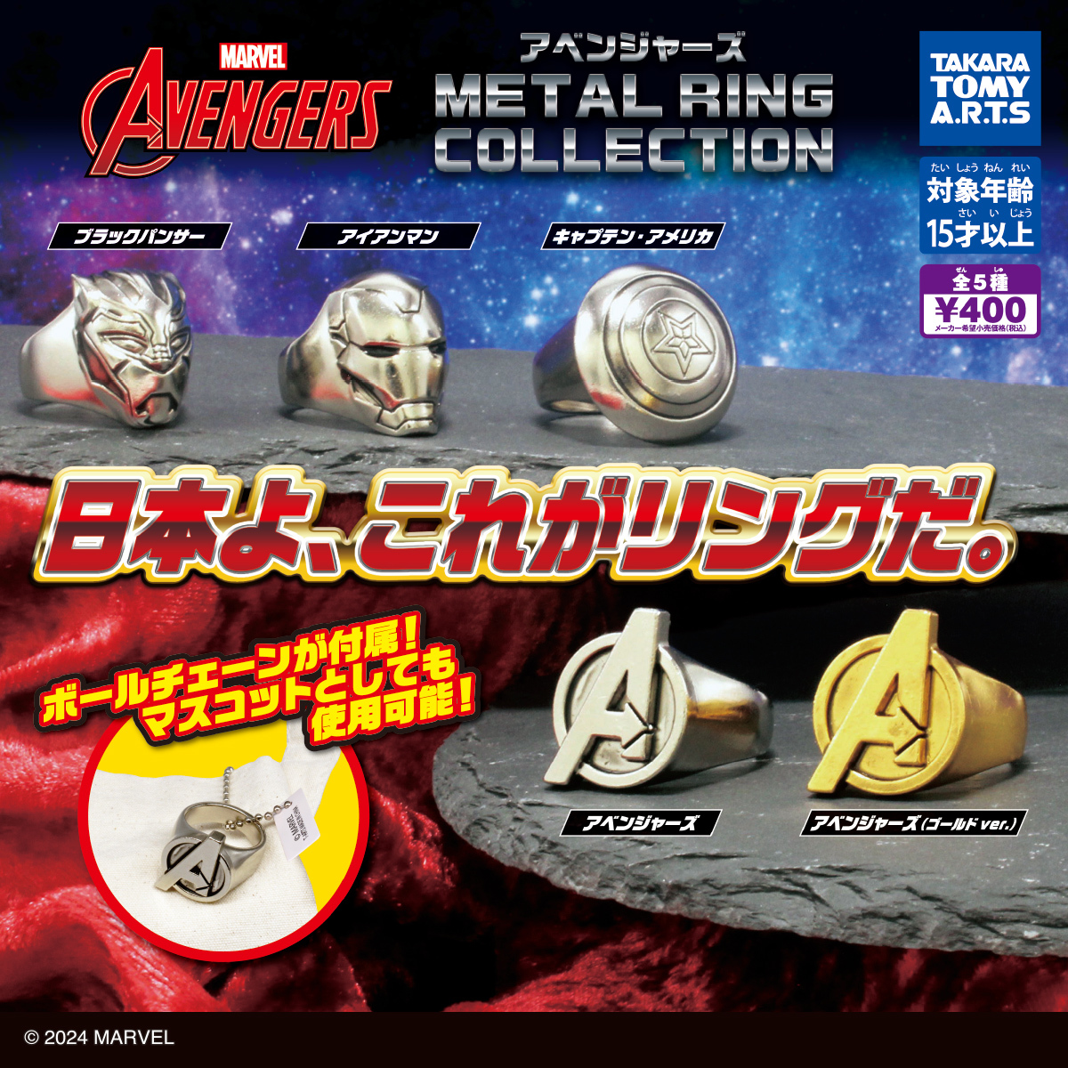 日本玩具、雜貨製造商 T-ARTS(株式会社タカラトミーアーツ)在本(3)月要推出 MARVEL 主題的中二新作「復仇者聯盟 金屬戒指收藏」(アベンジャーズ METAL RING COLLECTION)轉蛋!一共有五種款式,建議售價為每轉 400 日幣。