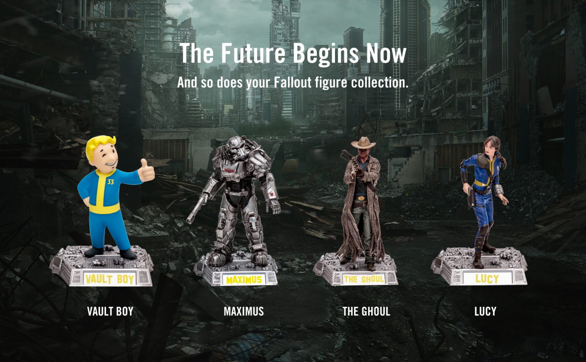 本次共推出四款《異塵餘生》影集系列商品,分別是由演員 Walton Goggins 飾演的「The Ghoul」、Ella Purnell 飾演的「Lucy」、由演員 Aaron Moten 飾演,身穿 T-45 動力裝甲的 「Maximus」,以及異塵餘生系列的吉祥物「避難所小子(Vault Boy)」。T-45 動力裝甲的造型和原版遊戲中略有不同,金屬色噴塗與戰損質感的呈現為其增添了許多故事性,不禁令人好奇在本次的影集中會有什麼樣的呈現。