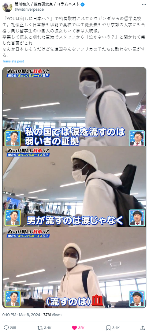 近日日本 X 上有推主分享,節目上一位來日本唸書的烏干達學生,他的故事格外感人外,對他的談吐更是讚譽有加且頗受尊崇,到底這位異地學生有怎麼樣的故事呢 ?