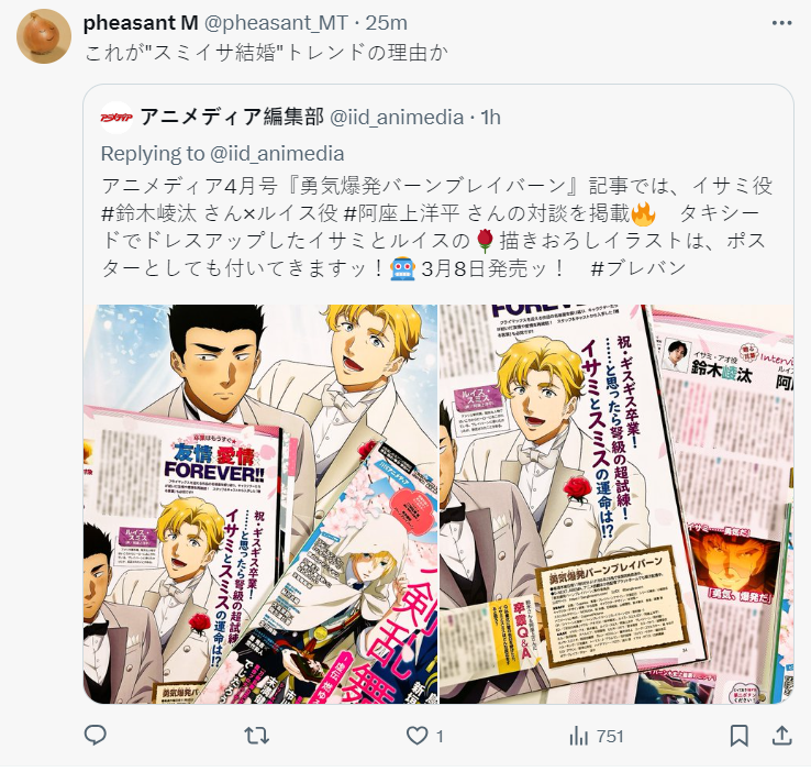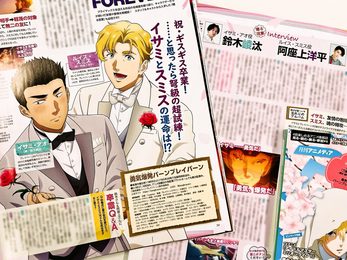 今日 ( 3/7 ) 日本動畫雜誌月刊 Animedia ( アニメディア ) 釋出 4 月號內容,其中包含《勇氣爆發Bang Bravern》勇蒼 & 史密斯聲優鈴木崚汰與阿座上洋平訪談,內頁插圖更用上了兩人穿上西裝的造型,讓不少粉絲大為驚艷,成為網路話題。