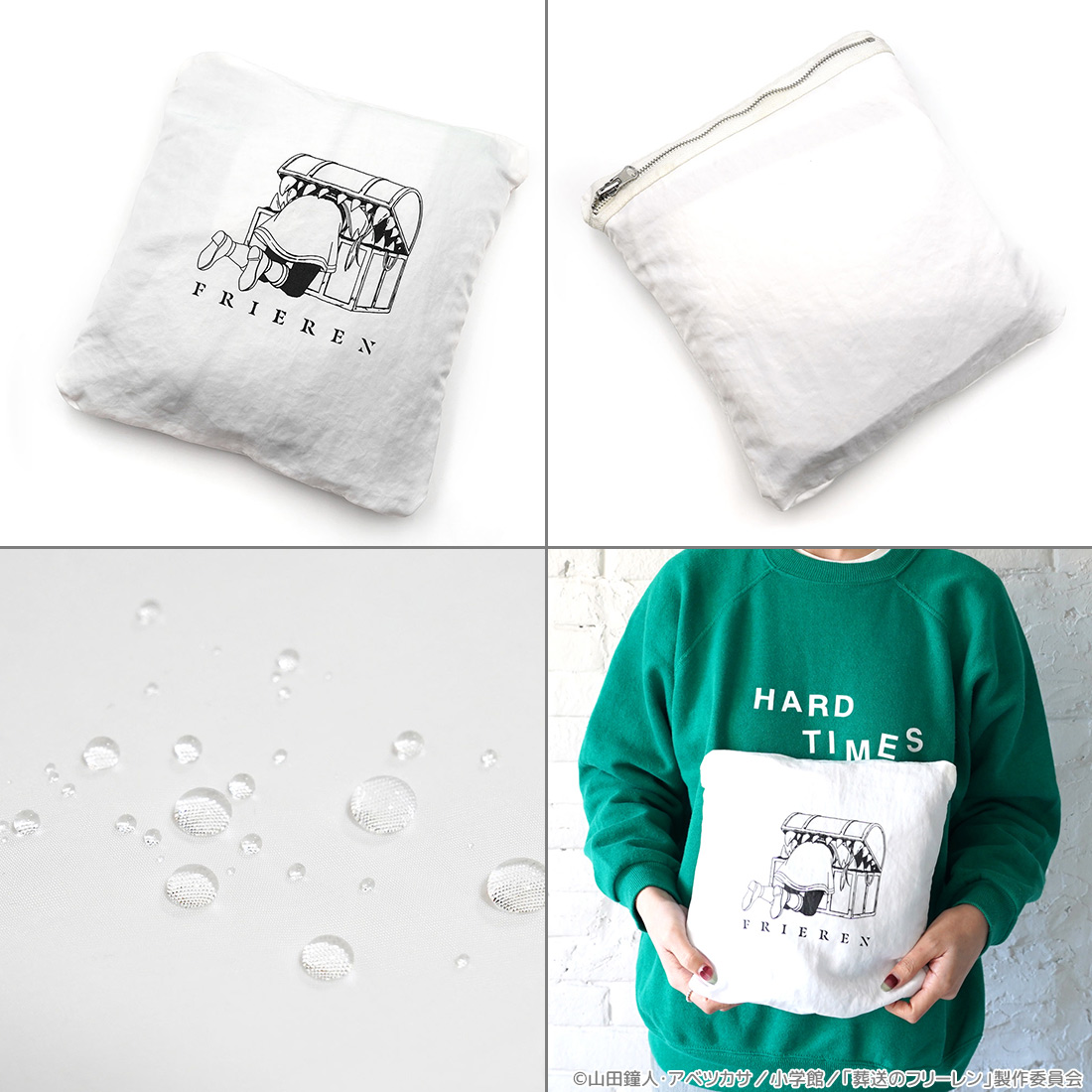 除了防風性和保溫性外,它是可以折疊並存放在後袋中,使其緊湊且方便旅行。當收納折疊後,會顯露出印有芙莉蓮被寶箱怪吃掉的圖案,可說是巧思設計 XD。