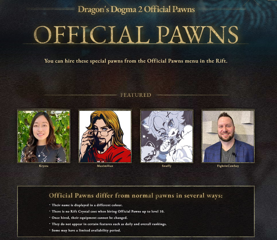除了玩家的捏臉創作之外,CAPCOM也與多名業界創作者、直播主等,一齊參與由官方發起的「OFFICIAL PAWN」,也就是能夠在異界石選單中「OFFICIAL PAWN」等雇用的特別隨從,而玩家也能夠從遊戲特徵中,判斷哪個是一般隨從,哪個是官方隨從。包含: