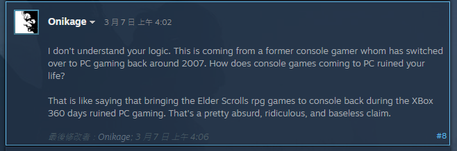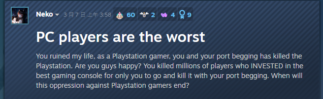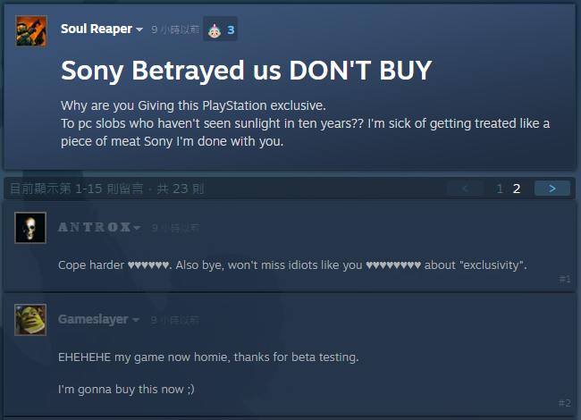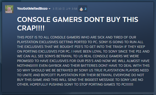 更惡劣的是,當中還有極端玩家將這股不滿的怒氣直接對向PC玩家,嗆聲「PC玩家就是垃圾」,聲稱都是因為PC玩家對PlayStation不合理的要求,才會導致官方做出這項決定,影響主機玩家的遊戲生活。當然這則發言,也很快地被PC玩家吐槽邏輯怪:「我玩PC到底是要影響你什麼?」、「那你為什麼會有Steam帳號?」
