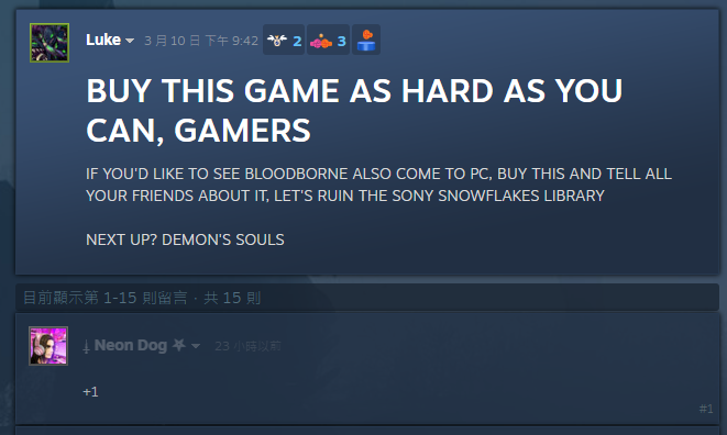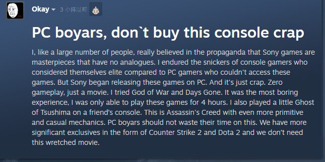 也因為這波派系戰爭,PC玩家也來個反向操作,呼籲其他玩家「一定要用力買下《對馬戰鬼 導演剪輯版》」、「PC玩家們,不要買垃圾主機!」來試圖嘲諷、刺激PlayStation主機玩家,在一則又一則的討論貼文上互相打起鍵盤戰爭。
