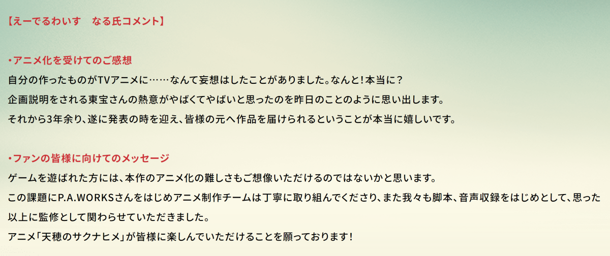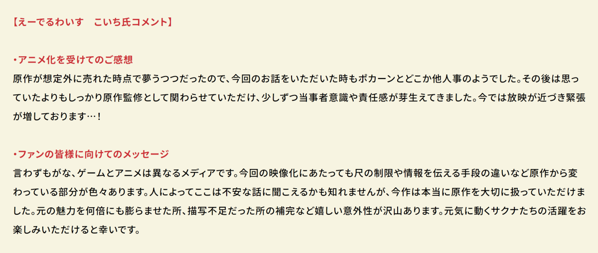開發團隊 EDELWEISS 的原作編劇こいち也表示,當初賣超過 100 萬款以上我就已經覺得不可思議了,現在居然要製作成動畫,當初接到這個企劃時我還以為沒我的事情 www。開始投入這項工作時我才體驗到責任感,現在揭露這項消息時更加緊張。