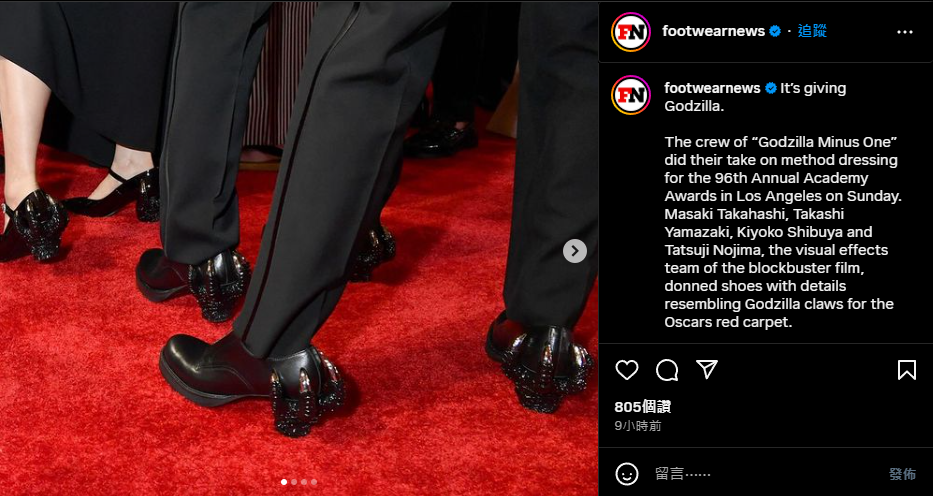 當然,除了頒獎主場外,台下的花邊細節更也成為媒體影迷們的另類焦點。其中《IGN》等多家外媒就發現,《哥吉拉-1.0》導演山崎貴與他的團隊成員,除了手上各捧著大大小小的哥吉拉模型出席,腳上更是穿著有著爪子的「哥吉拉特製鞋子」,整整齊齊地踏上奧斯卡紅毯。