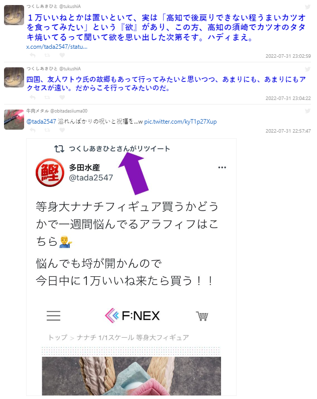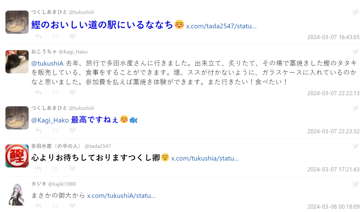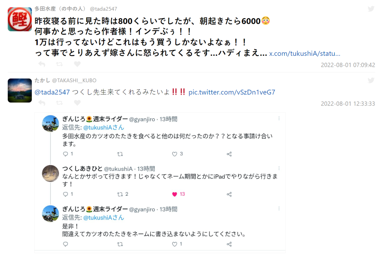 結果被作者土筆章人轉推發問,還表示「自己很想去高知縣吃美味鰹魚,沒想到這位店主也是水產專門,這個想吃的慾望突然由生出來」,開玩笑說自己有朋友住那邊,不過離現居地有點遠,但還是很想去四國走走。