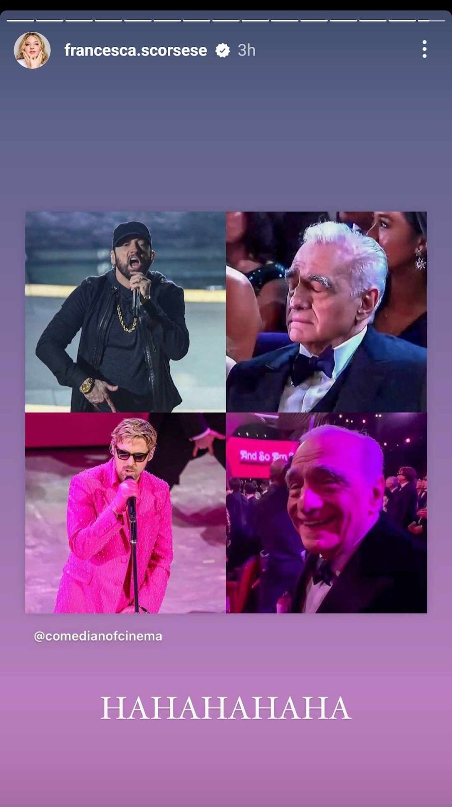 隨後有網友找到 2020 年饒舌歌手阿姆(Eminem)在奧斯卡現場表演時,馬丁在台下被拍到的冷淡反應,當時這個表情過沒多久也成為迷因,如今再度被網友拿出來做對比,也被法蘭西絲卡本人分享到 IG。