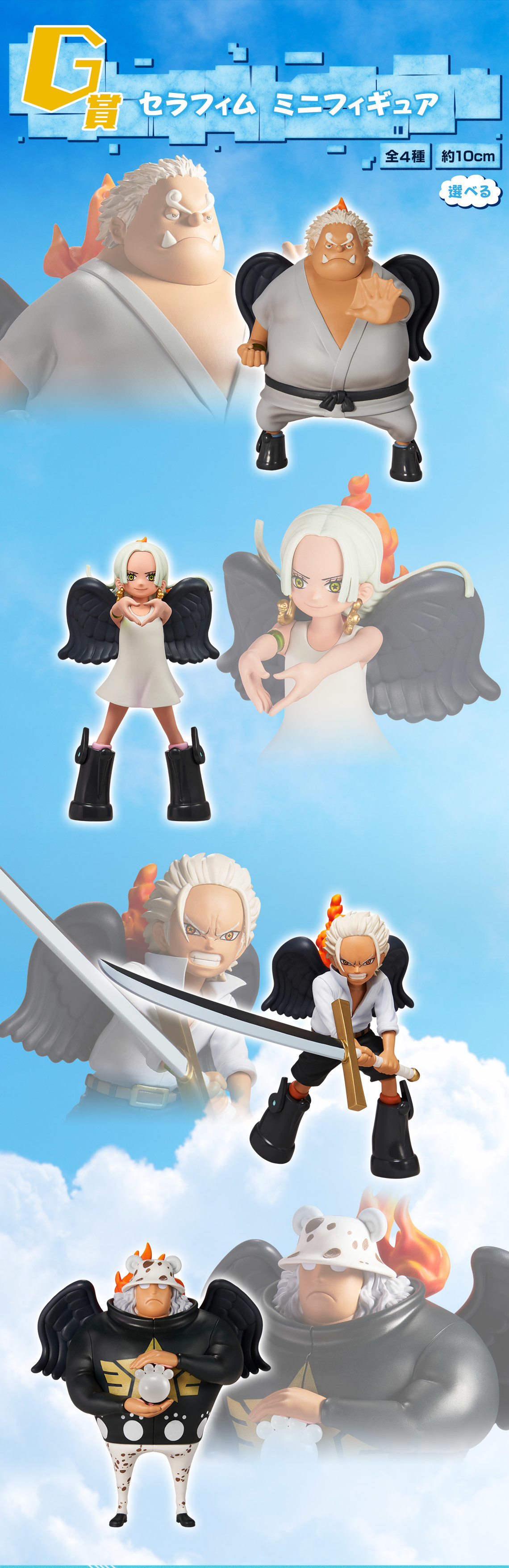 本次的「航海王 未來島——蛋頭」圍繞著蛋頭篇的主題推出 A~K、最後一賞與雙重中獎賞等不同級別的賞品。A 賞~ D 賞為未來島篇多位要角的角色模型,分別為 A 賞 蒙其 D 魯夫、 B 賞 羅羅亞索隆、C 賞 珠寶波妮、D 賞 羅布路基,而 G 賞則將推出的 S- 蛇、S- 鷹及 S-鯊魚熾天使迷你人物模型,是新和平主義者熾天使首次在一番賞亮相,相當的令人期待!