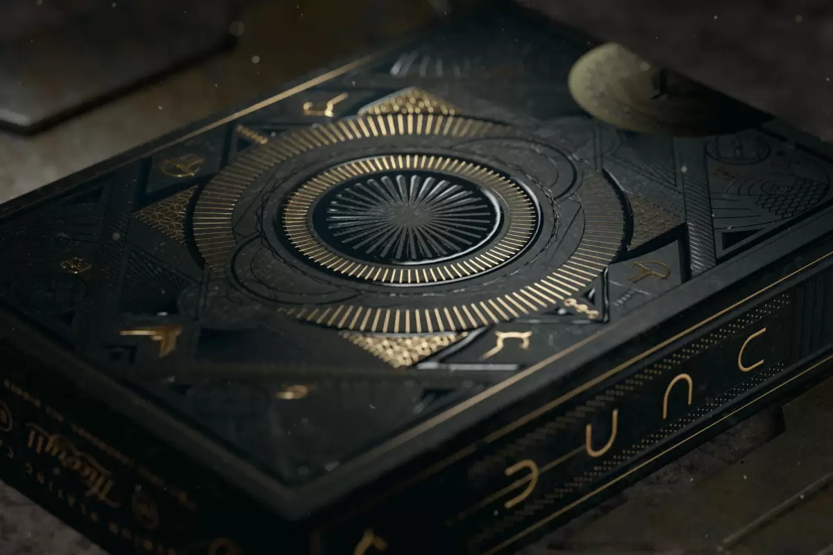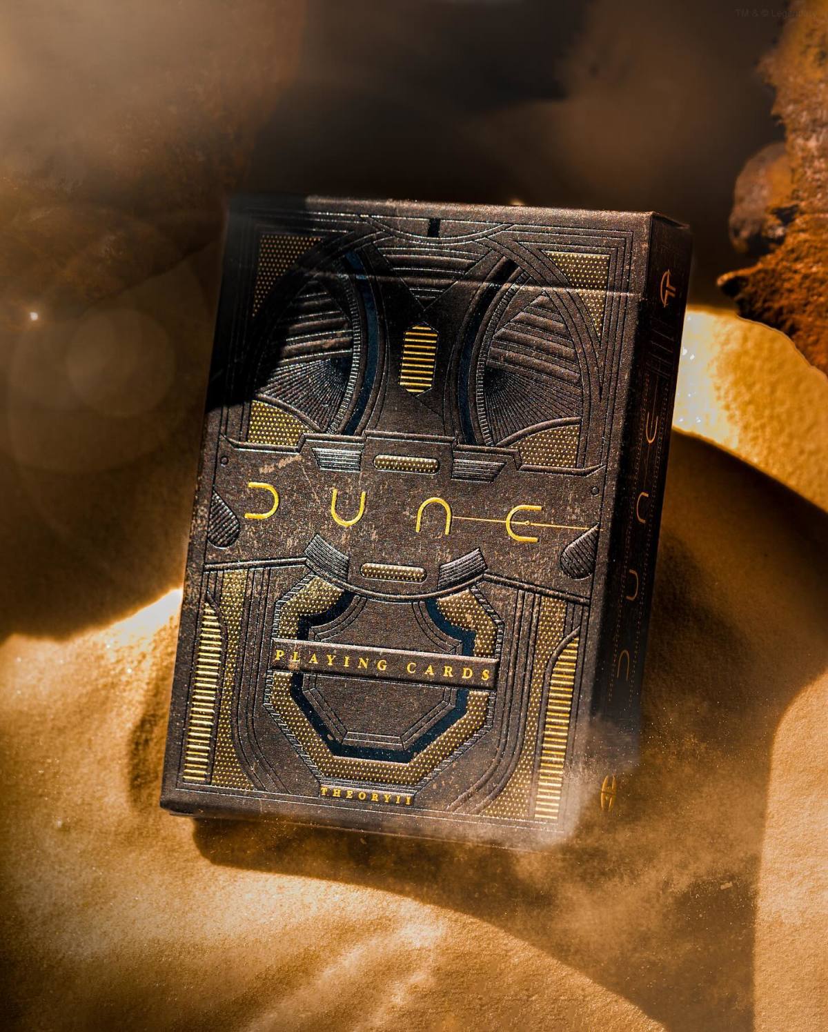 這次「沙丘收藏級撲克牌」的包裝外盒是以蒸餾服為題設計,在打造出豐沛層次感與精美細節的同時,將沙丘的 LOGO「DUNE」、theory11 的品牌字樣注入,加上整體的黑金調性與圖案刻畫,散發出一流的質感。