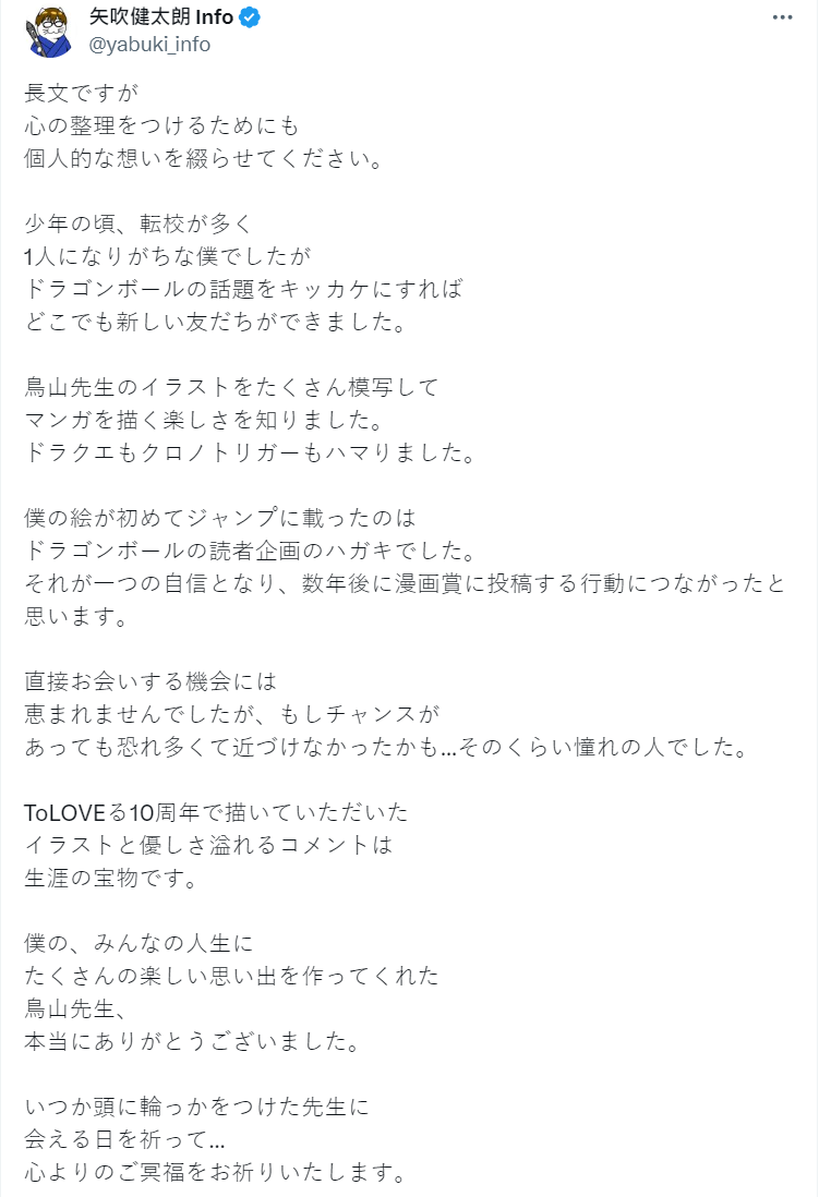 近日因為《七龍珠》作者鳥山明去世的消息,日本不少同業甚至非業界人士都發文弔唁表示悲痛,而矢吹健太朗老師也分享了鳥山明對自己的影響,以及帶給他的童年時光。