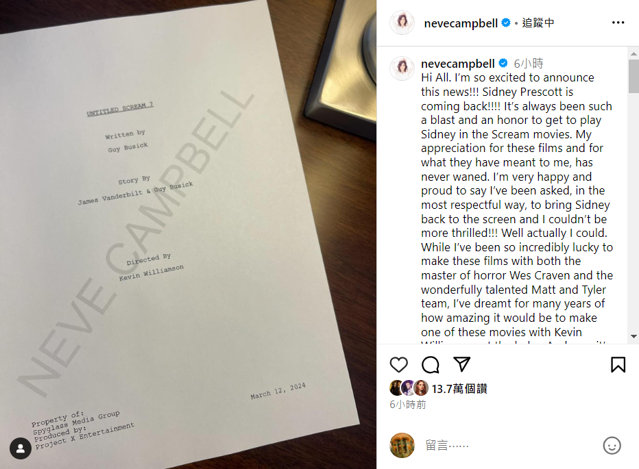 一共參演了該系列五集、唯獨缺席第六集的妮芙坎貝兒(Neve Campbell),稍早在 Instagram 貼出了第七集的劇本封面,並驚喜向粉絲宣佈,她不僅將回歸主演第七集,而且還會與本系列的元老編劇-凱文威廉森(Kevin Williamson)再度合作,因為威廉森這次將首度親自接下導演筒。