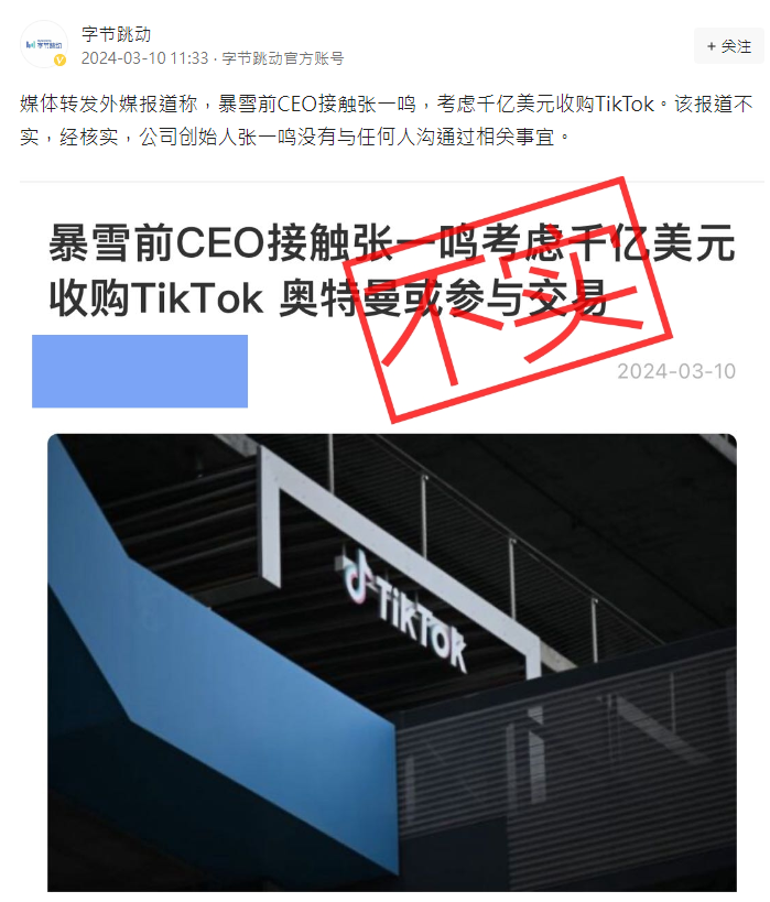 中國字節跳動官方澄清,創辦人張一鳴並沒有與前任動視暴雪執行長Bobby Kotick,或是任何人談論收購TikTok相關事宜。