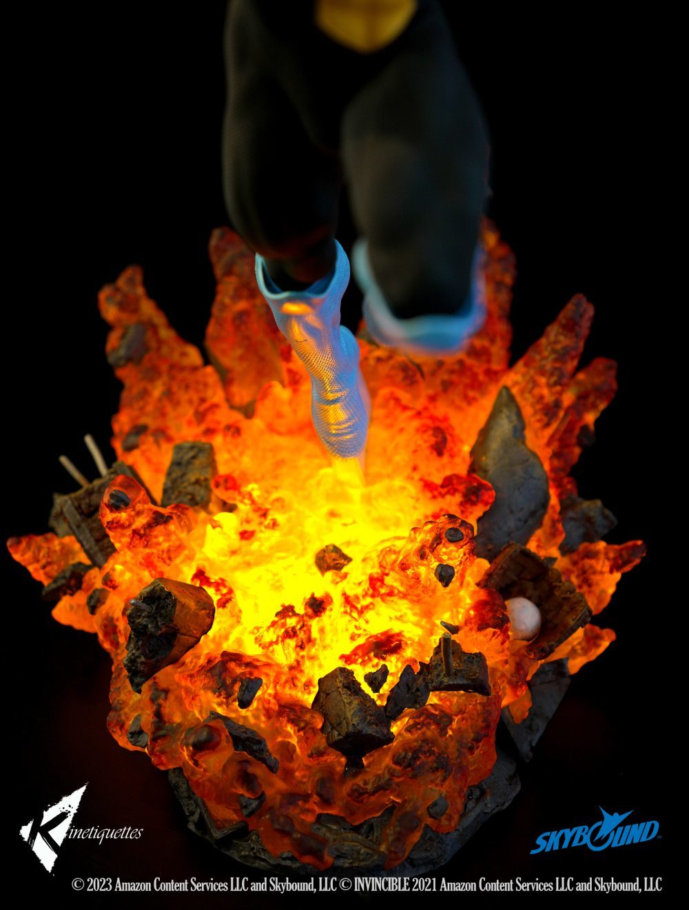 本次的「馬克葛瑞森」1/4 比例收藏雕像以《無敵少俠》漫畫家 Ryan Ottley 2022 年繪製的《無敵少俠》第八話會場限定版漫畫封面為原型製作,全作高約 62 公分,將無敵少俠——馬克・葛瑞森起飛的動態立體化,底座做有 LED 發光設計,展現出他起飛時如爆炸般的能量!英雄服裝上紋路細節透過塗裝和雕刻完美的還原,拉伸姿態展露的精實肌肉也在黃藍黑配色的服裝下顯現。講到無敵少俠那原作中的血腥元素是絕對不可少的,作品也將附上馬克・葛瑞森戰損的頭雕以及雙手沾滿鮮血的替換件,血漬巧面的停留在替換件的接線前,不論是哪種頭雕配件都能夠展現無敵少俠帥氣的戰鬥姿態!