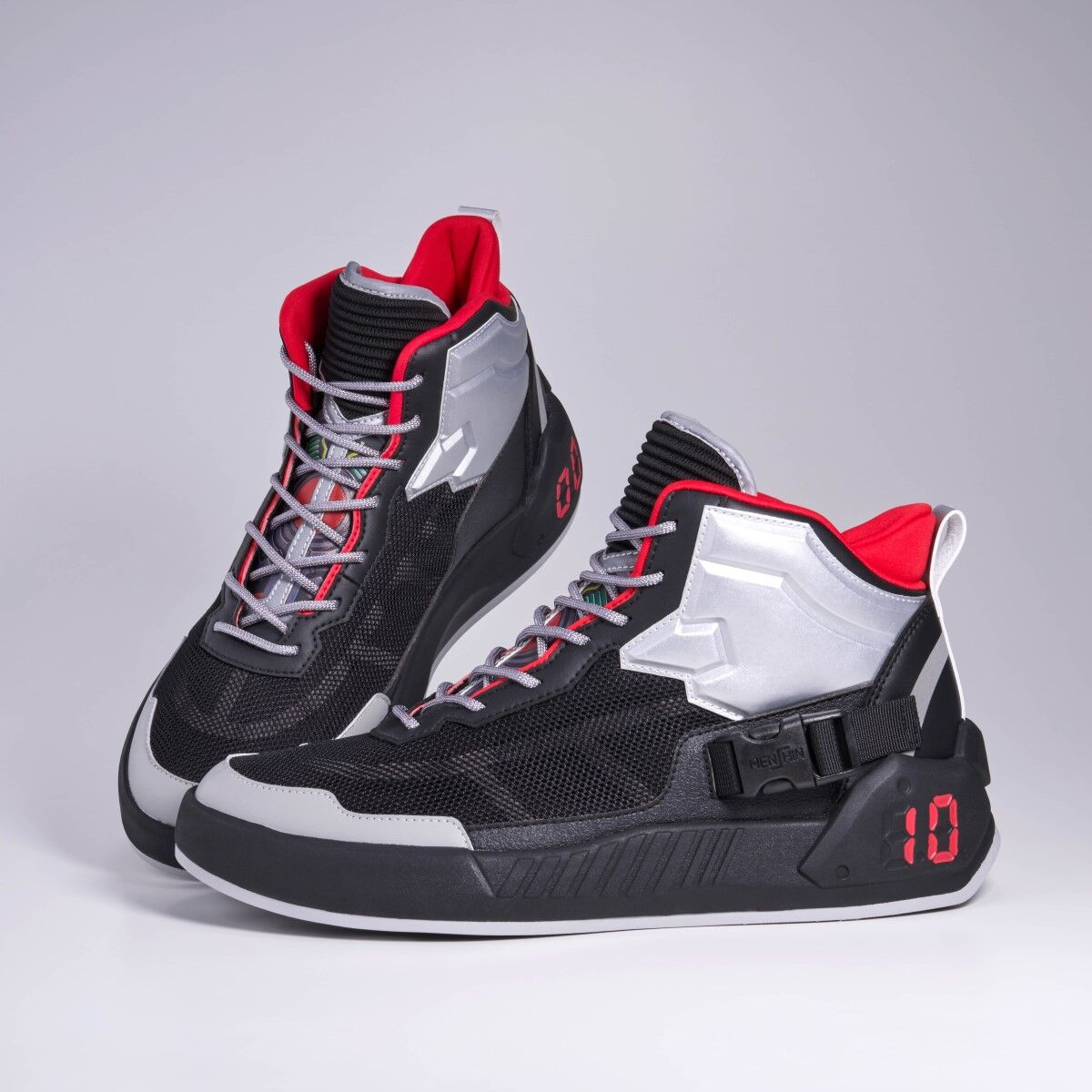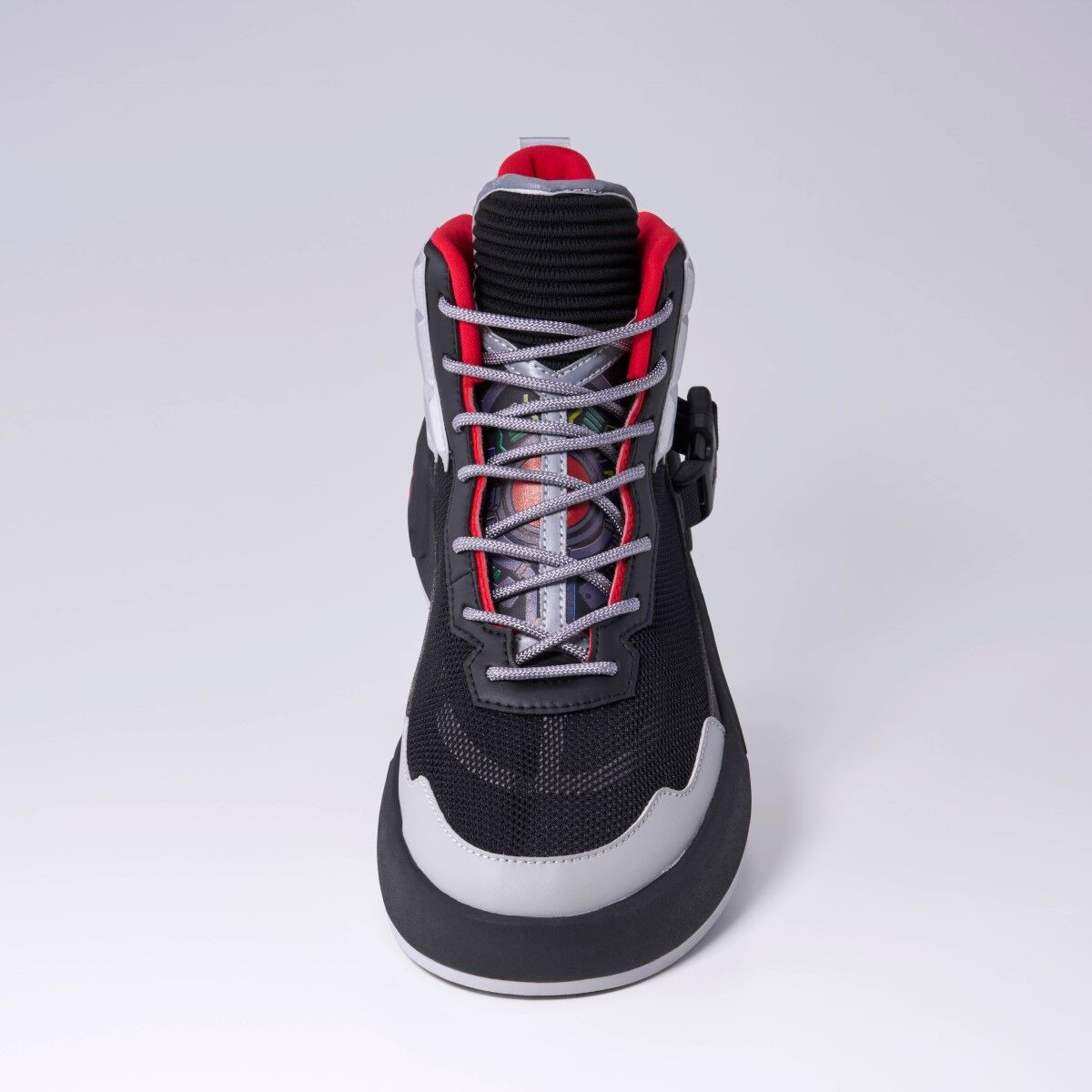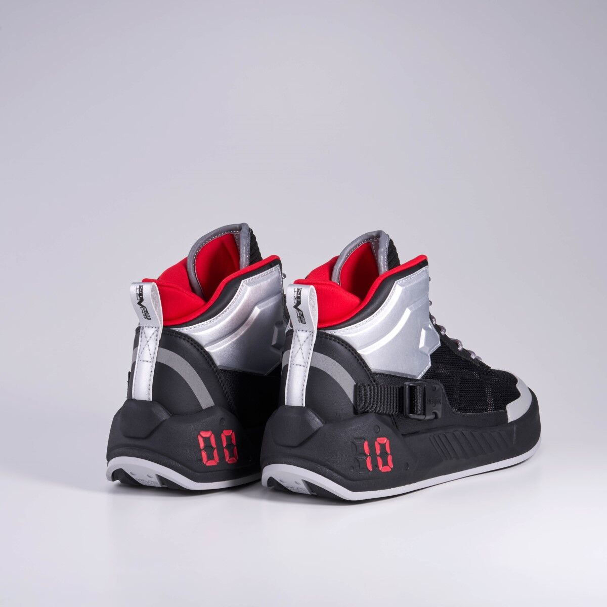 這次推出的造型球鞋,以 Faiz 加速型態的黑紅銀三色為靈感打造,鞋跟兩側有著象徵加速型態能維持的 10 秒以及結束的 00 秒數字,也附有品牌一貫的鞋身織帶與扣具。