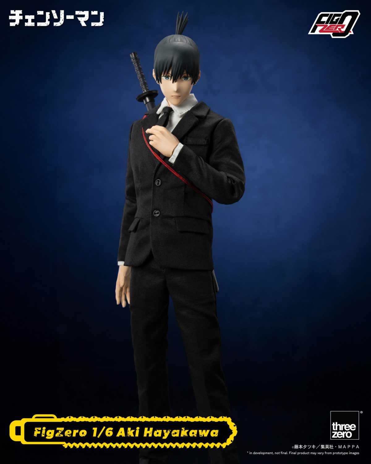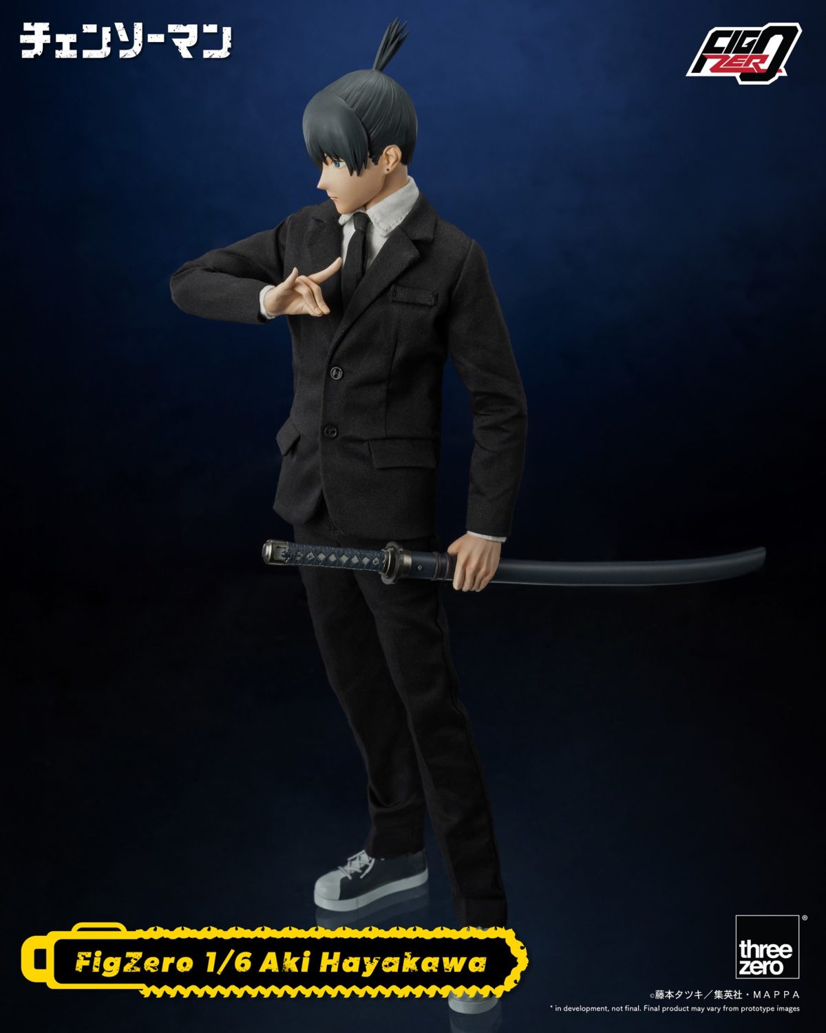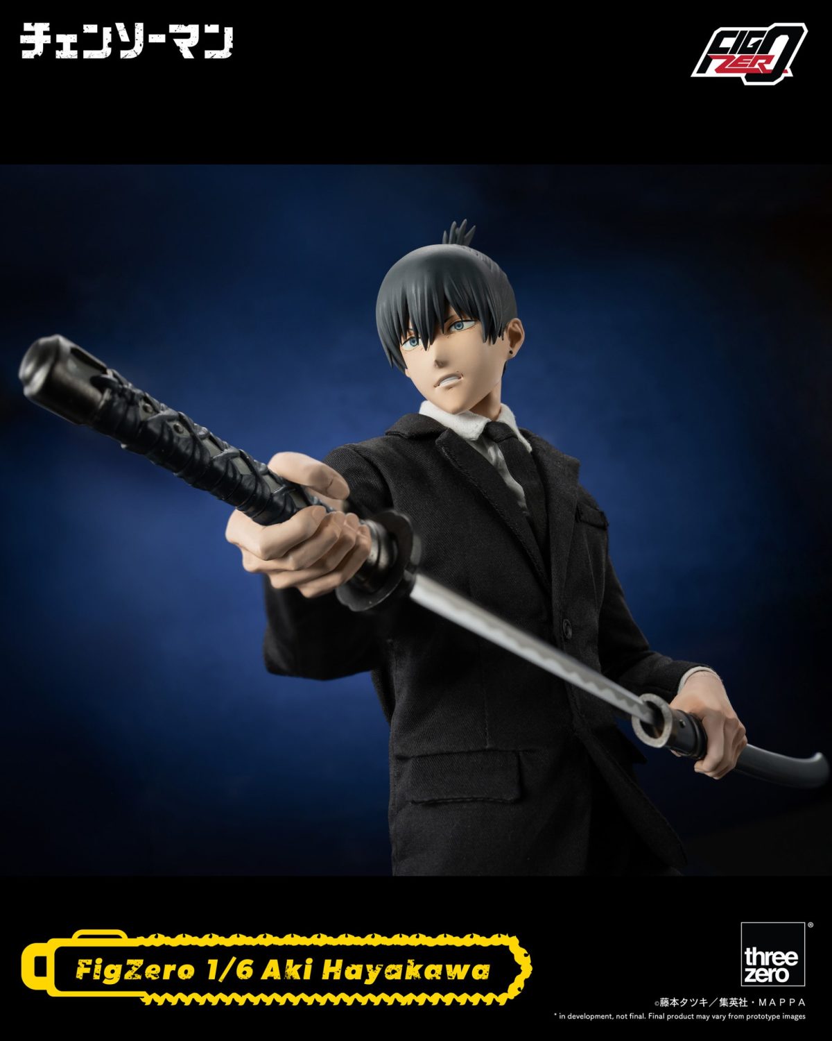 「FigZero 早川秋」1/6比例可動人偶,尺寸全高約 11.9吋(30.3公分),全身共有超過 35 個可動關節,將阿秋身穿招牌的襯衫制服、直立髮髻及黑色耳環等特徵造型還原,公安部制服及西裝外套採用布製,領帶內藏金屬線,可以隨著動作擺出適合的造型。配有兩款可更換的臉部零件(嚴肅表情/皺眉表情)和拳頭、握持武器、拿香菸、狐之手等可以替換的手勢,搭配釘狀武士刀(連刀鞘)、背心帶、一把武士刀及刀鞘、槍之惡魔的肉片等豐富的配件,賞玩各種情境的秋!