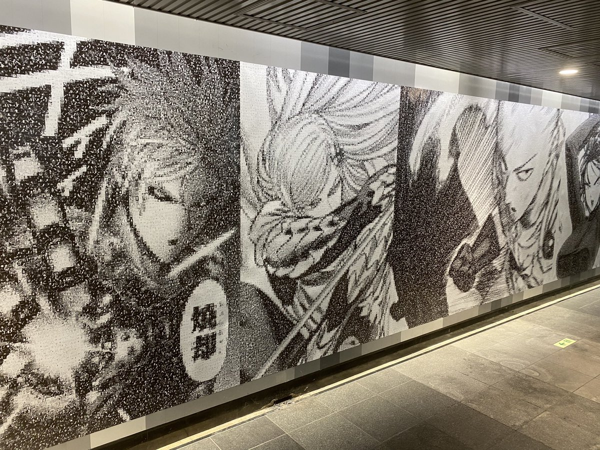 遠遠看可能不清楚,不過會發現人物似乎跟往常有點不一樣,拉近一看竟然是馬賽克構圖,整個人物都是由一個個細小的漫畫格排列而成,像是主角琦玉,拉近看每一格都是在漫畫中的構圖,這也是繪師村田雄介的巧思,也分享在個人 X 上邀請粉絲去欣賞。