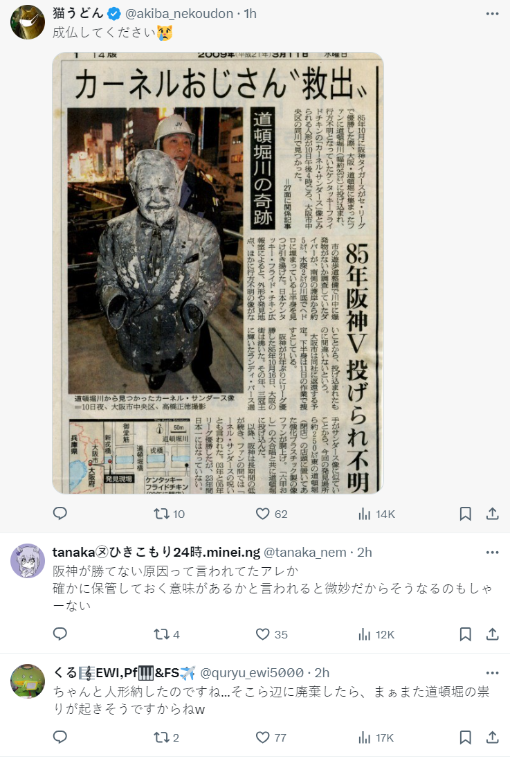 畢竟當年被扔到道頓堀河水中過了數十年才尋回,不少人對其有一定的感情,也希望它功成身退後可以安詳,此外因為阪神虎也已經奪冠破除魔咒,肯德基爺爺銅像在此時離去也是十分巧合。
