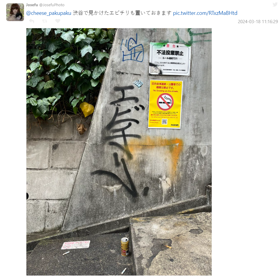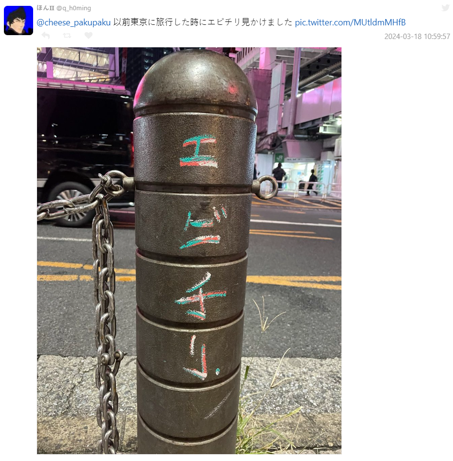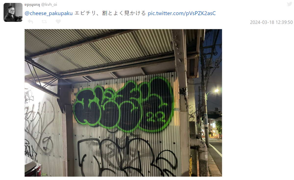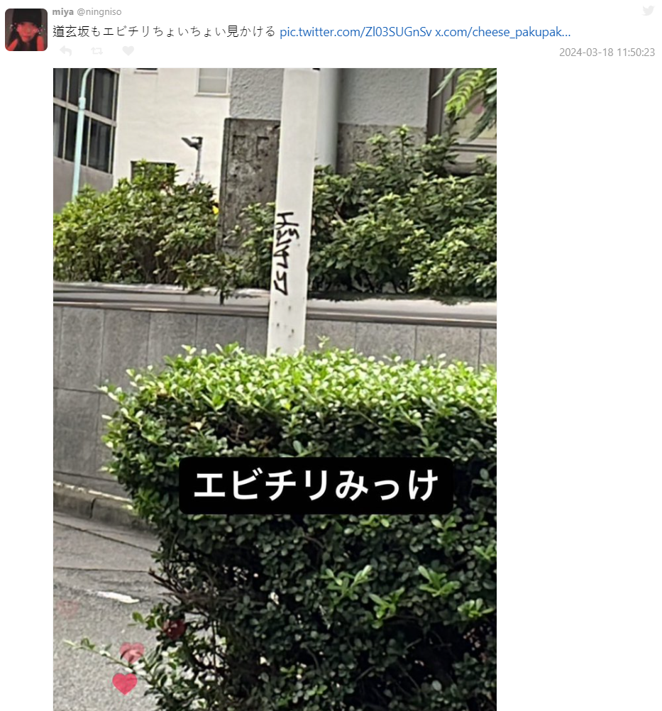 事實上這個「エビチリ」現象已經有好幾年了,日本網友也指出幾乎在東京都一帶甚至到名古屋都可以見到,似乎是某些塗鴉團體的標誌性文字。