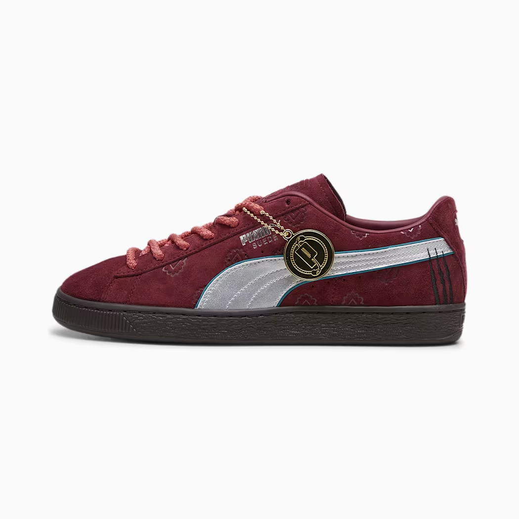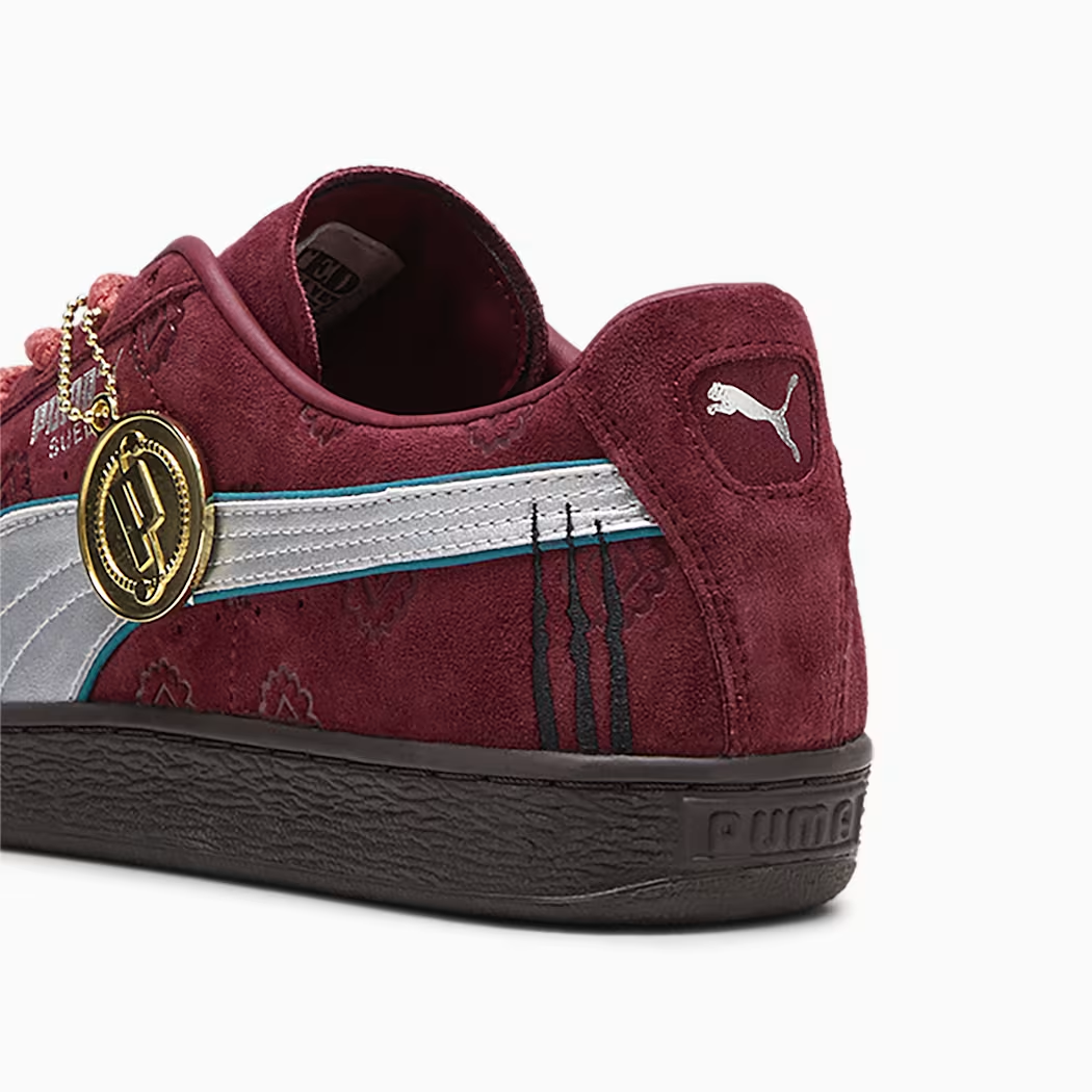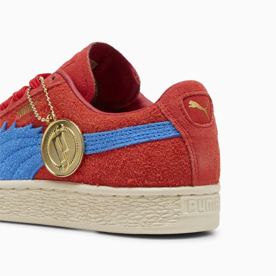 選用紅色的麂皮為基處,在 PUMA 標誌的彎刀使用巴其頭髮的藍色造型來設計玩味,鞋舌上也有巴其海賊團的 Logo,算是非常亮眼的配色款。