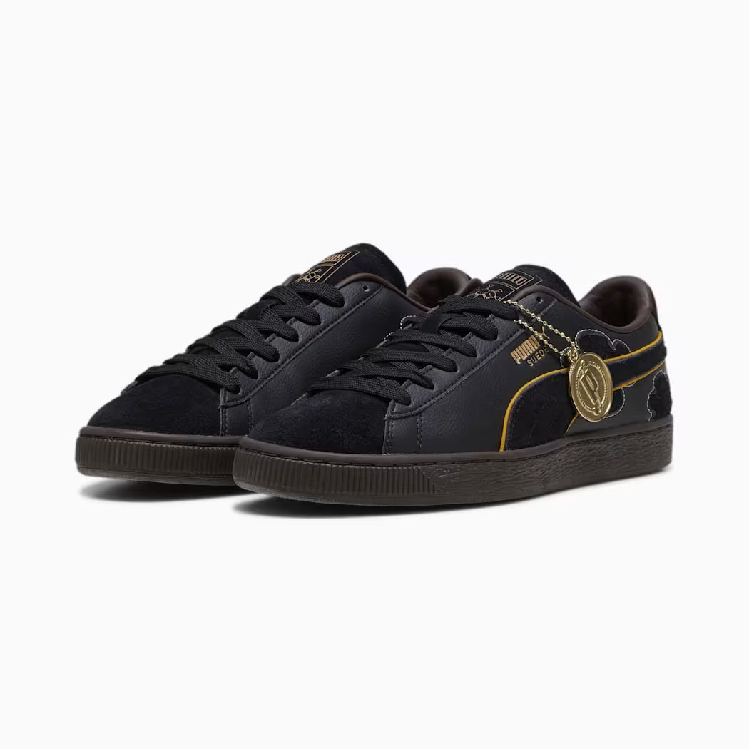 選用黑色皮革混麂皮的異素材風格出發,在 PUMA 標誌的彎刀上以金邊作點綴,鞋舌上也有黑鬍子海賊團的 Logo,算是低調中隱約有著奢華氣息的鞋款。