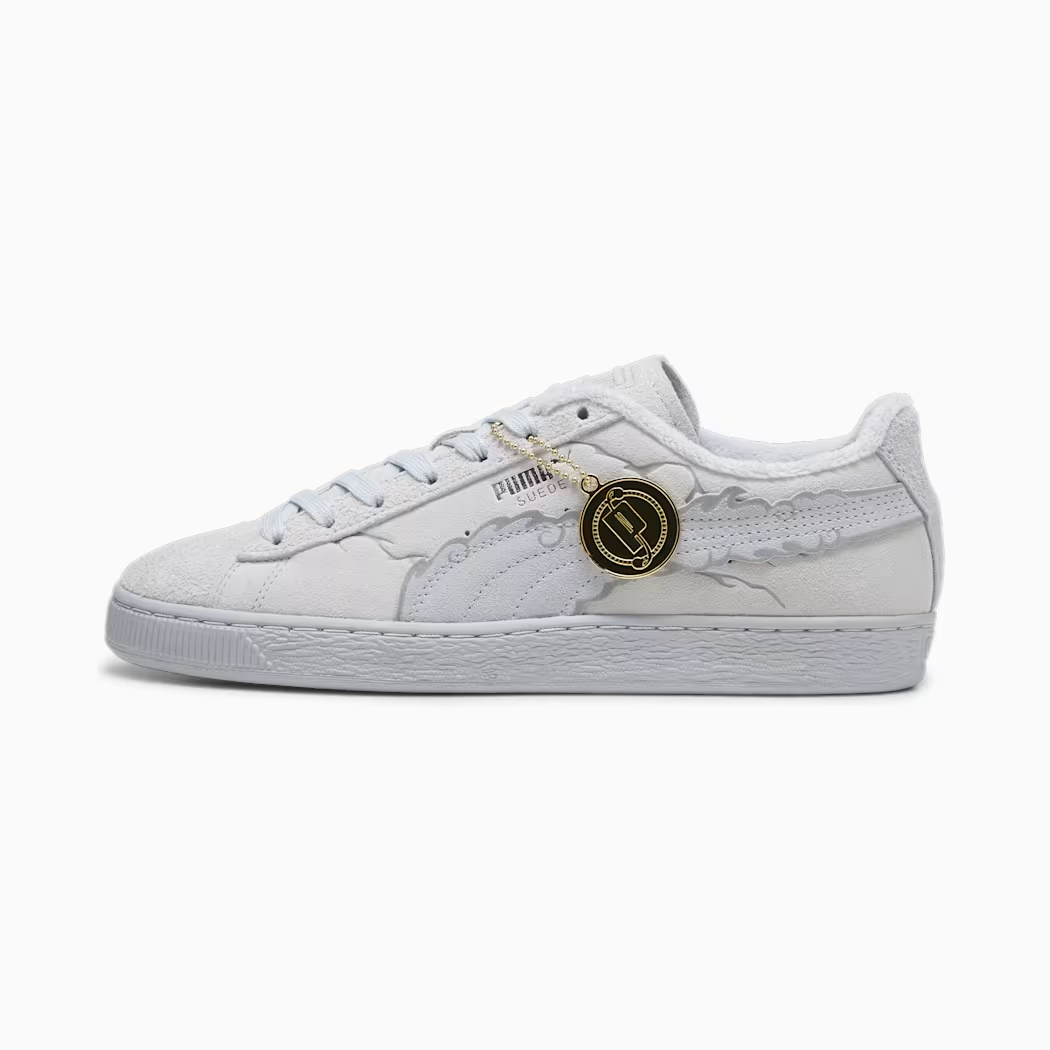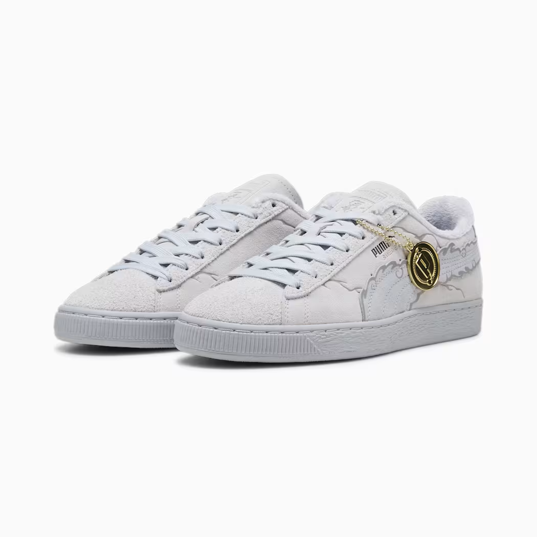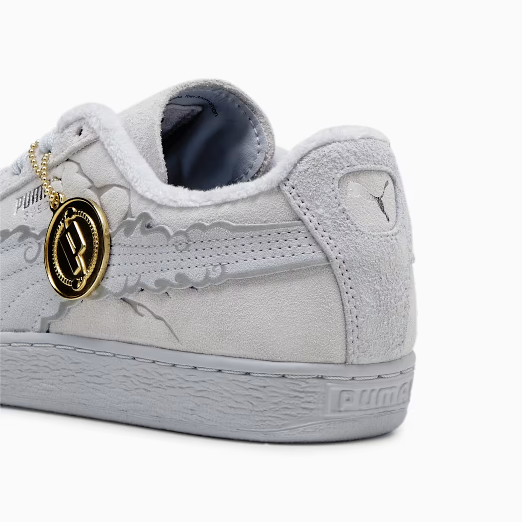 選用灰白色的麂皮為基處,在 PUMA 標誌的彎刀使用「太陽神尼卡型態」類似雲朵的造型來呈現 ,鞋舌上也有魯夫人物的剪影圖案,算是樸實好搭的款式選擇。