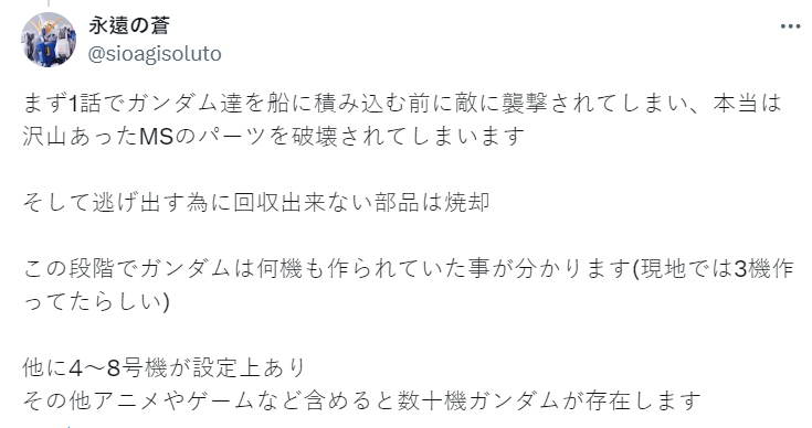 推主永遠の蒼 ( @sioagisoluto ) 貼出,這是過去京都友都八喜提問的「一年戰爭中開發的鋼彈共有幾台?」,這個問題可說是讓人感到...就算是真正的鋼彈粉絲能夠準確回答嗎 www。